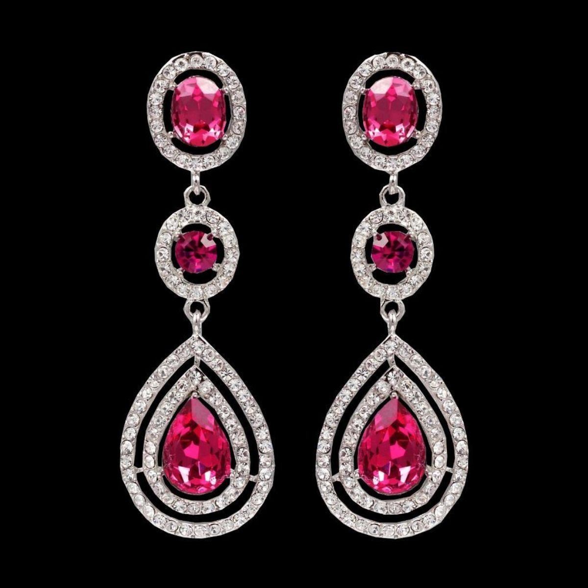 Raspberry pink Czech crystals ( pear faceted ) dangle from round faceted crystals in a darker pink shade in the center, attached to another tier of oval faceted crystals, rhodium-plated chandelier dangle earrings. 2.75" L.