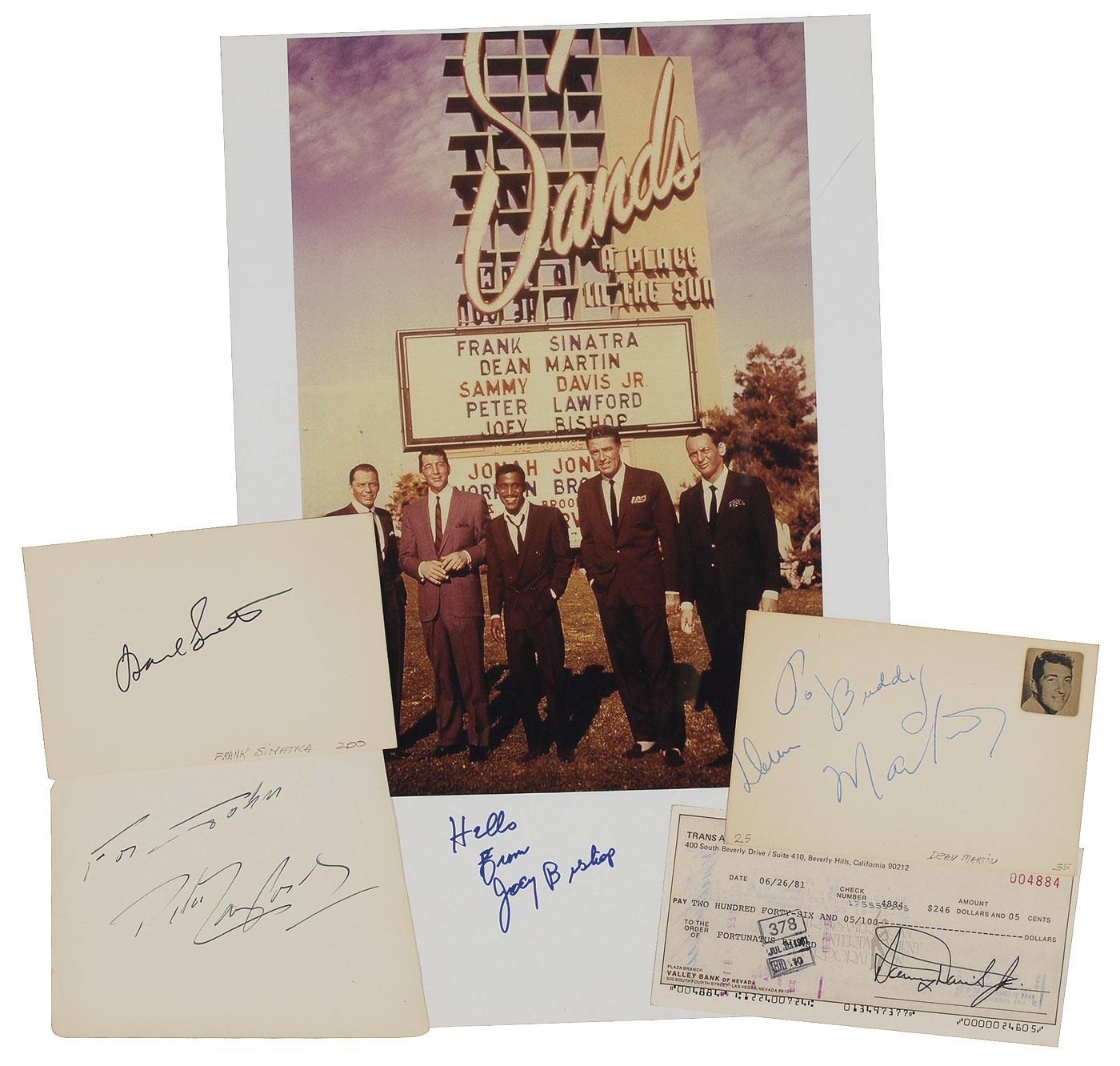 Five items: felt tip in-person signature “Frank Sinatra,” on an off-white 6 x 4 card; vintage ink in-person signature and inscription of Dean Martin on an off-white 6 x 4 card; vintage fountain pen in-person signature and inscription of Peter Lawford on an off-white album page; a Trans American Entertainment Corporation check, filled out in type and signed by Sammy Davis, Jr., dated June 26, 1981; and a color cardstock 11 x 17 photo of the Rat Pack posing in front of the Sands marquee, signed in blue felt tip, “Hello from Joey Bishop.” In fine condition.