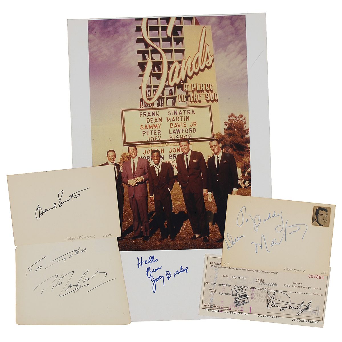 Five items: felt tip in-person signature “Frank Sinatra,” on an off-white 6 x 4 card; vintage ink in-person signature and inscription of Dean Martin on an off-white 6 x 4 card; vintage fountain pen in-person signature and inscription of Peter Lawford on an off-white album page; a Trans American Entertainment Corporation check, filled out in type and signed by Sammy Davis, Jr., dated June 26, 1981; and a color cardstock 11 x 17 photo of the Rat Pack posing in front of the Sands marquee, signed in blue felt tip, “Hello from Joey Bishop.” In fine condition.