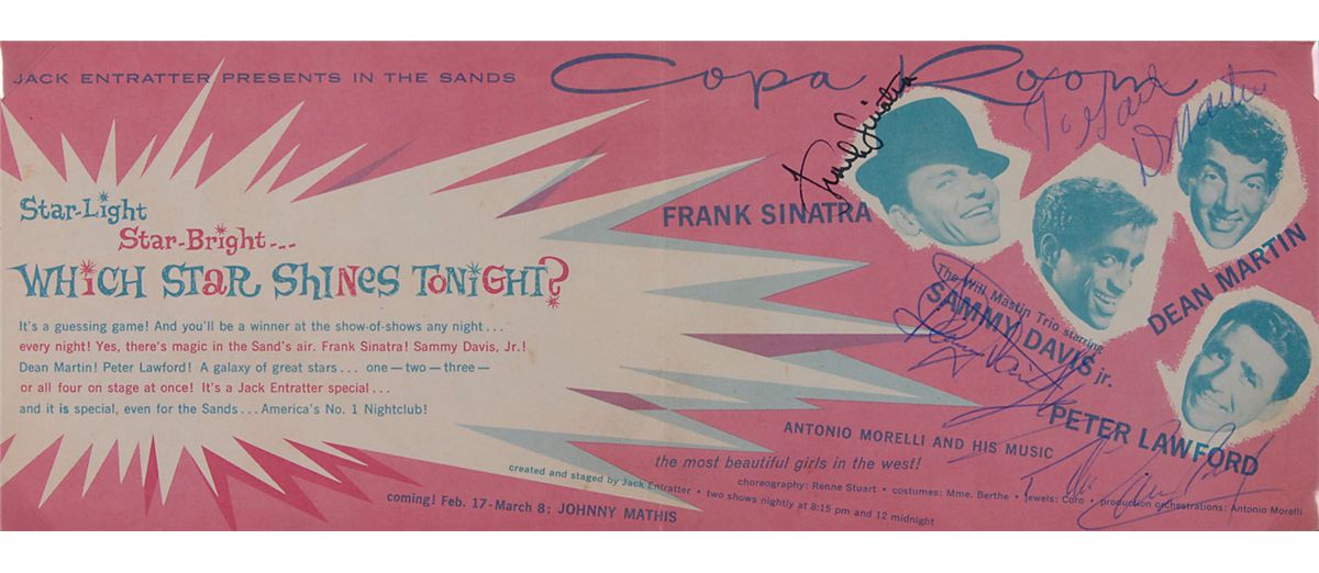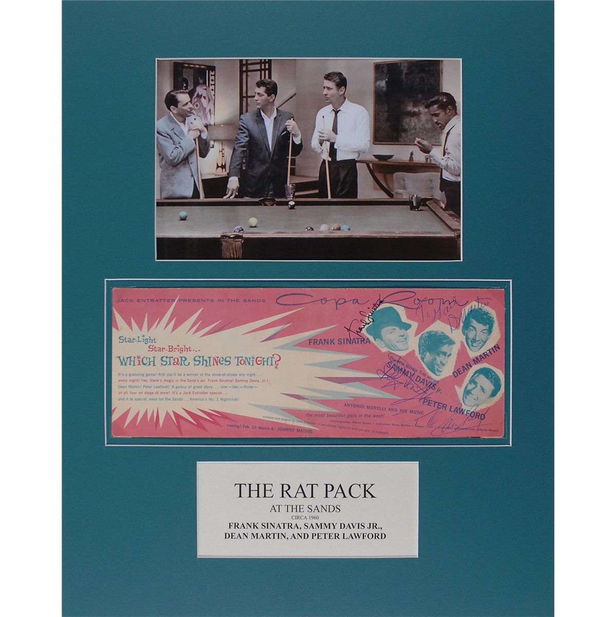 Flyer for a series of performances by members of the Rat Pack at the Sands circa 1960, 12.5 x 4.75, signed in blue ballpoint and black ink by Frank Sinatra, Sammy Davis, Jr., Peter Lawford, and signed and inscribed in blue ballpoint, “To Gail, D. Martin.” Removably corner-mounted and matted with an unsigned photo to an overall size of 16 x 20. In fine condition. Consignor notes that the item was obtained from a family whose daughter worked at the Sands in the 1960s. The attraction of the show stemmed from the fact that the audience never knew what they would get—it could be one of the stars, all four, or any combination. An outstanding piece from the legendary entertainers.