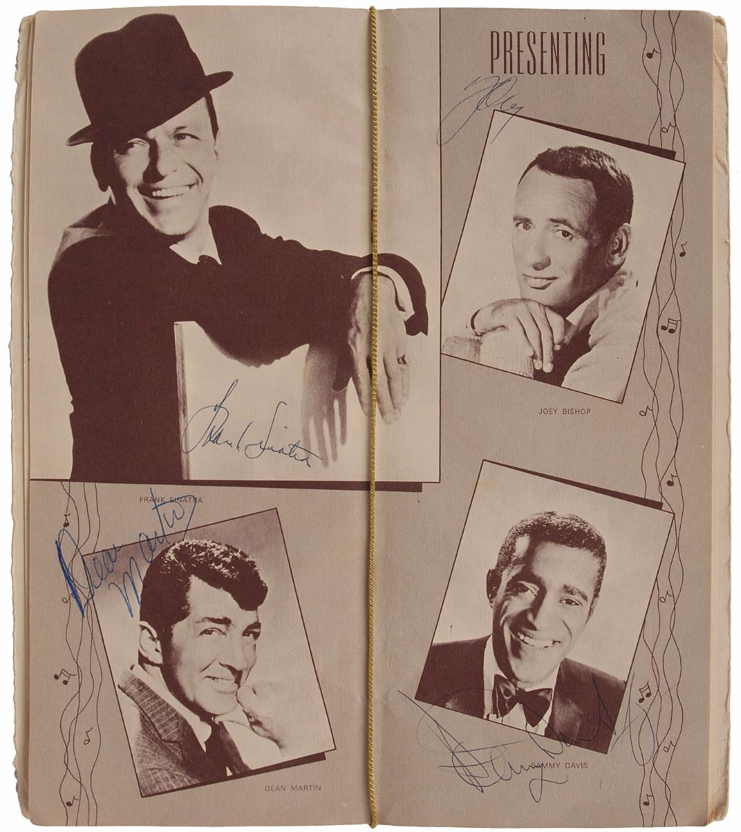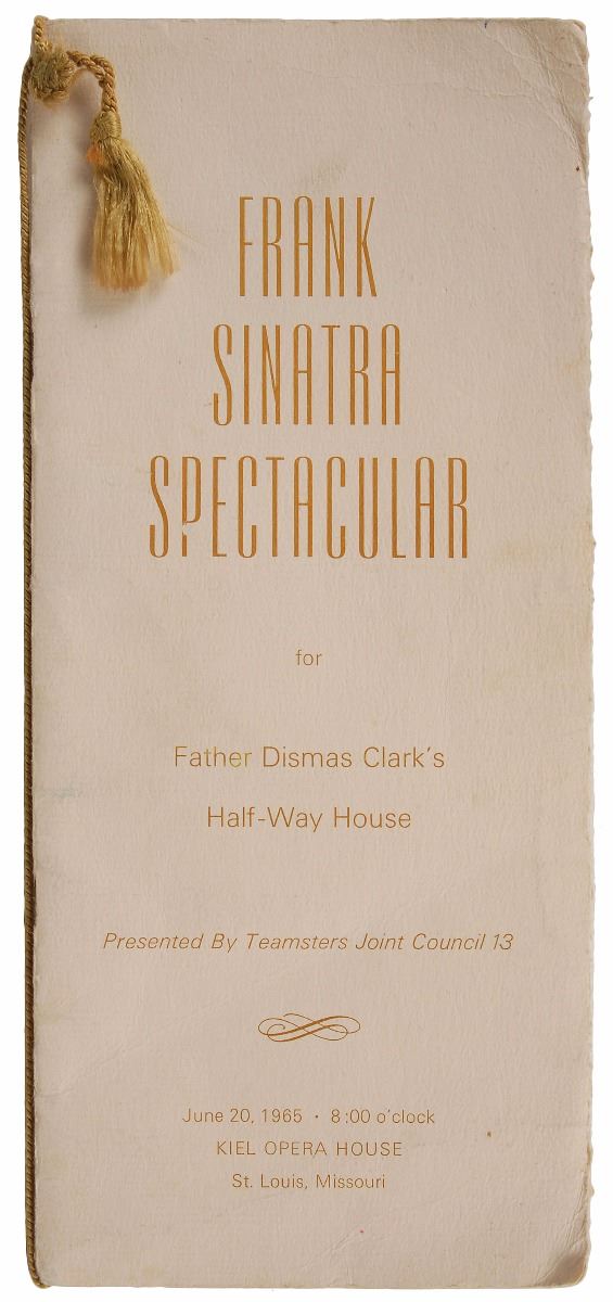Program from the Frank Sinatra Spectacular for Father Dismas Clark’s Half-Way House held at the Kiel Opera House in St. Louis, Missouri, on June 20, 1965, 5.5 x 12.25, signed inside in ballpoint by Frank Sinatra, Sammy Davis, Jr., Dean Martin, Count Basie, and by a member of The Four Step Brothers. Includes a flyer signed by Johnny Carson, with caption text stating that he “is here to fill in for his good friend, Joey Bishop.” In fine condition, with handling wear and cover creasing not affecting the signed spread. On June 20, 1965, Sinatra organized a ‘summit meeting’ in St. Louis as a fundraiser for one of his favorite charities, Dismas House, the first halfway house for ex-convicts. As a precursor to pay-per-view events, the special was originally televised to a select group of theaters. Fellow Rat Pack member Joey Bishop had hurt his back and was replaced as host by Carson.