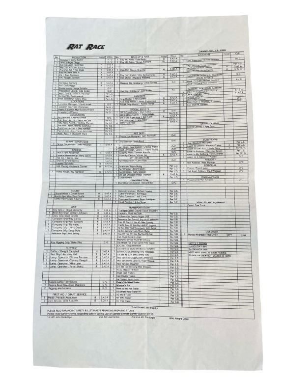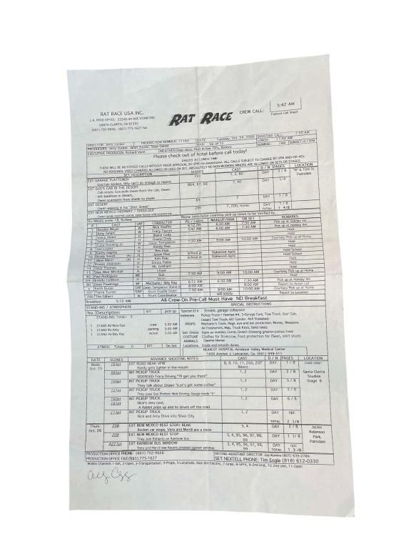 Original call sheet used in the production of the Jerry Zucker directed Comedy film 'Rat Race (2001), which features an ensemble cast consisting of Rowan Atkinson, Whoopi Goldberg, Cuba Gooding Jr., Wayne Knight, Jon Lovitz, Kathy Najimy, Lanei Chapman, Breckin Meyer, Amy Smart, Seth Green, Vince Vieluf, John Cleese and Dave Thomas.