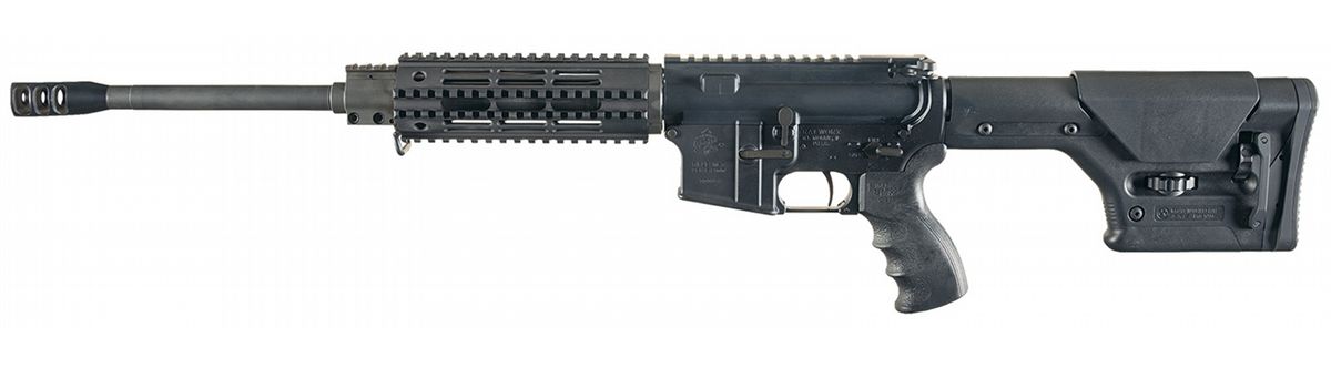 Produced without sights, with a flat-top gas block and upper receiver, flat-tipped muzzle brake, ventilated quad-rail forearm, First Samco C-27 pistol grip and a Magpul PRS adjustable buttstock. Upper is chambered for 223 Remington, with the lower marked for 6.8mm SPC. Magazine not included.