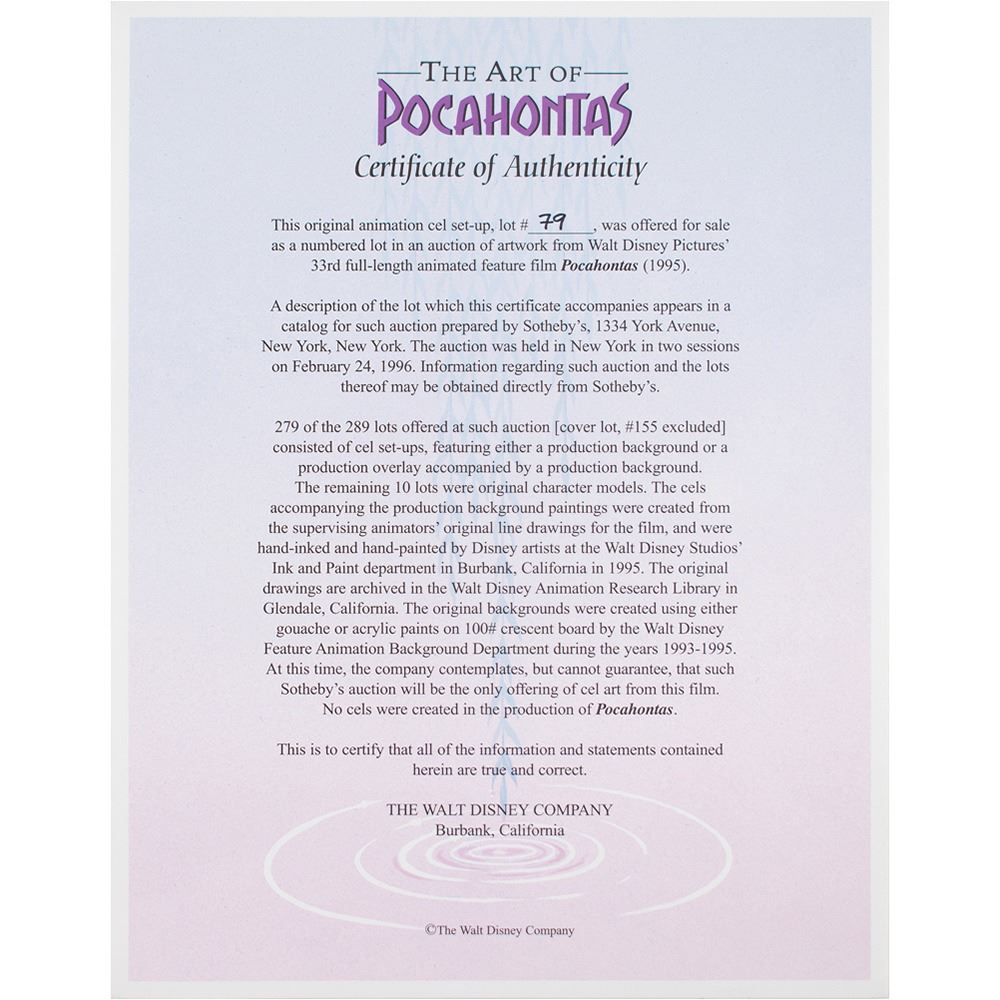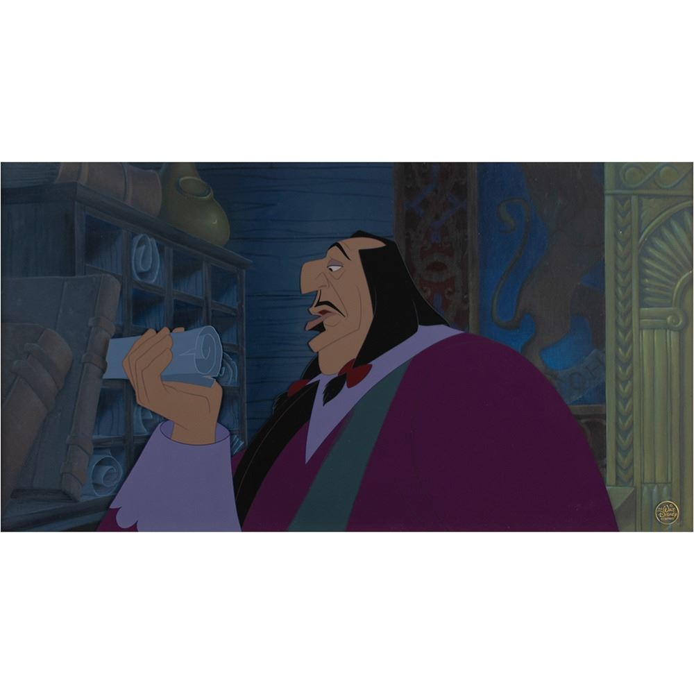(Walt Disney Studios, 1995) Original hand-painted custom cels prepared specifically for these production backgrounds featuring Ratcliffe and Wiggins from Pocahontas, showing them in large close-up poses. The cels, hand-painted by Disney artists from the supervising animators' original line drawings for Disney's 'Art of Pocahontas' sale at Sotheby's, are placed on their matching hand-painted production backgrounds from the film. The Governor Ratcliffe image measures 14.75 x 8.5, with a mat opening of 20 x 10.5; the Wiggins image measures 12.5 x 9, with a mat opening of 16 x 10.5. Matted side-by-side to an overall size of 43.5 x 16.75. Both backgrounds have Walt Disney studio stamps on the reverse. In fine condition. Provenance: The Art of Pocahontas, Sotheby's, February 1996. Accompanied by a Walt Disney Company certificate of authenticity. A special, one-of-a-kind and highly displayable piece.