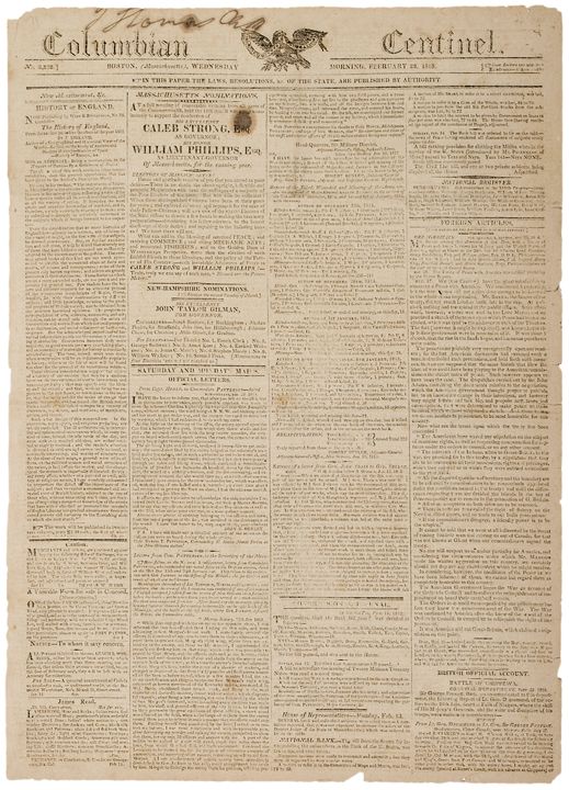 No. 3,222, 4-column layout, 14.25” x 19.75”, 4 pages. Scarce newspaper with first printing in Boston of the Treaty of Peace that ended the War of 1812. Page 2 has two wide columns headed: “RATIFIED TREATY OF PEACE AND AMIT Y/ A PROCLAMATION. JAMES MADISON, PRESIDENT OF THE UNITED STATES OF AMERICA,” with a complete printing of the treaty of Ghent, from Dec. 24, 1814, signed in type by Madison and James Monroe, who was Secretary of State. Includes other articles describing how the text of the treaty arrived by express, planned celebrations, detailed order of the procession to celebrate the Peace & Washington’s birthday, illuminations of buildings, and more. Page one has 2+ columns of official reports pertaining to Andrew Jackson’s victory at the Battle of New Orleans, fought in January before it was known that a treaty had been signed; includes a list of casualties; British military report on the Battle of Chippewa, and much more. Disbound, small edge tears, lightly toned. Ink stain on pages. 1 and 2, but generally quite nice--especially the woodcut masthead logo and other graphics!