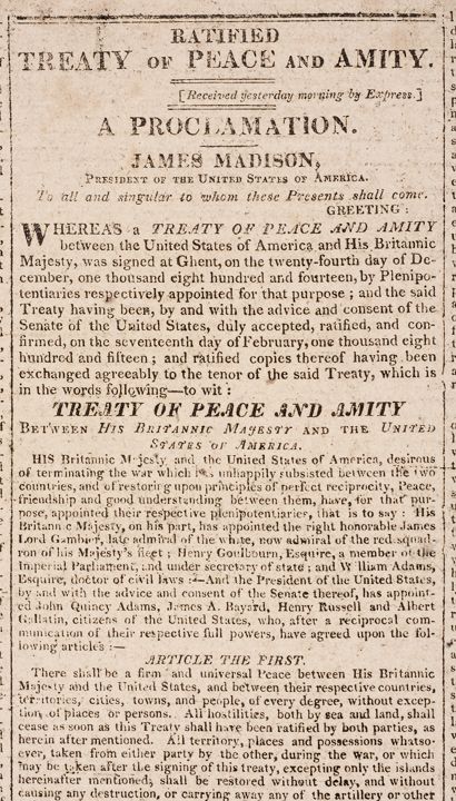 Ratification of the War of 1812 Treaty of Ghent, 1815