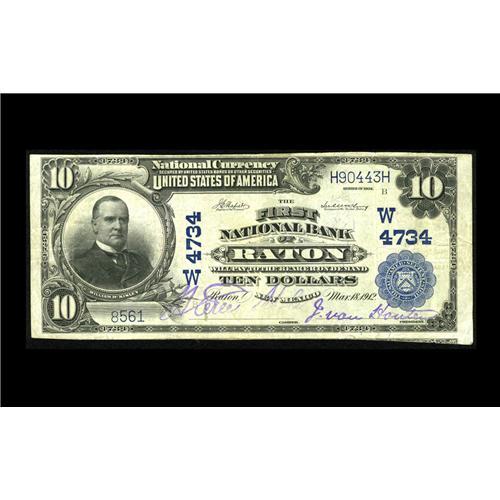<B>Raton, NM</B></I> - $10 1902 Plain Back Fr. 628 <B>The First NB </B></I> Ch. # (W)4734<BR>Large notes only from this bank, with this piece, which is newly discovered, one of the very highest grade state issue examples known. Sharp <B>Very Fine,</B></I> with vivid purple stamp signatures.