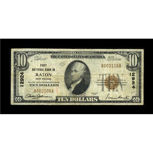 <B>Raton, NM</B></I> - $10 1929 Ty. 1 <B>First NB</B></I> Ch. # 12924<BR>Chartered in April of 1926, this northern New Mexico bank issued the 1929 series only. This problem free <B>Fine</B></I> will likely sell for...<BR><BR><b>Shipping:</b> Coin/Currency (<a target="_blank" href="http://www.heritageauctions.com/common/shipping.php">view shipping information</a>)