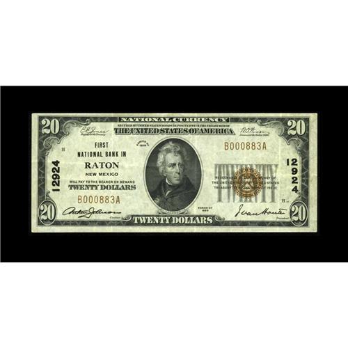 <B>Raton, NM</B></I> - $20 1929 Ty. 1 <B>First NB</B></I> Ch. # 12924<BR>A very nice note which is one of the highest grade examples we've seen from here. <B>Very Fine-Extremely Fine.</B></I><BR><BR><b>Shipping:</b> Coin/Currency (<a target="_blank" href="http://www.heritageauctions.com/common/shipping.php">view shipping information</a>)