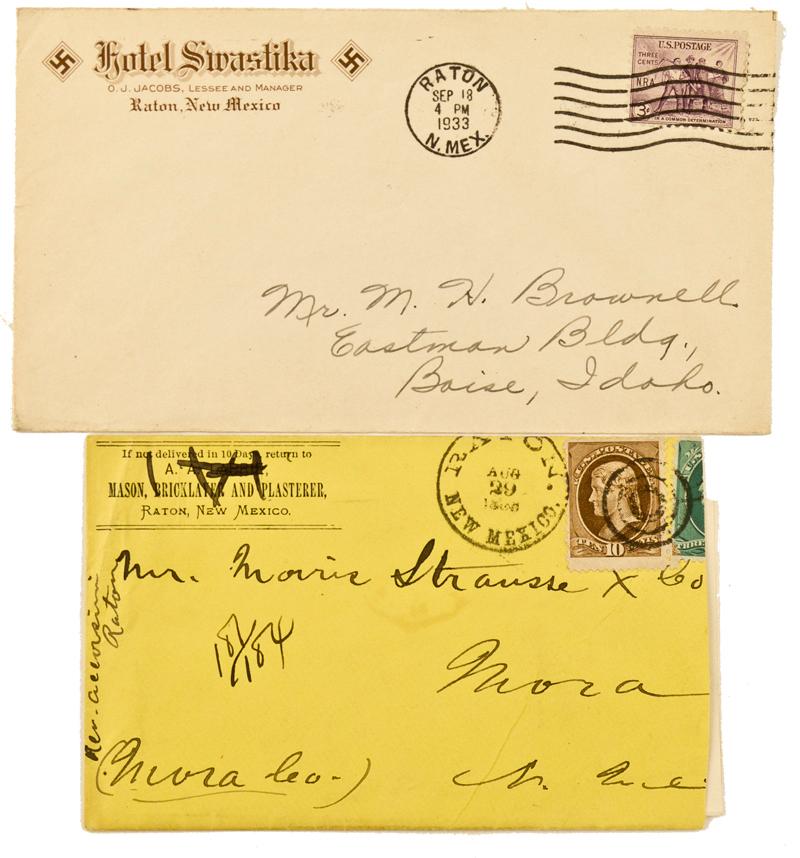 Lot of 2. 1) Yellow envelope with illegible contents. Dated Aug 29, 1883. Brown 10c and one green 3c postage stamp. Cropped on the right where only 1/4 of the green postage stamp is left. Cancelled. On the cover it is written to Strausse. Both contents and envelope are in great condition. 2) Tan cover with no contents. Dated Sep 18 1933. 3c purple postage stamp, cancelled. From Hotel Swastika to Mr. M. N. Brownell. The Swastika Hotel in New Mexico is now the International Bank; however the swastika sign of course is no longer there. Spanish for "mouse." The town of Raton grew with the arrival of the AT & SF Railroad to become the county seat and principle town in the northeast corner of the county.