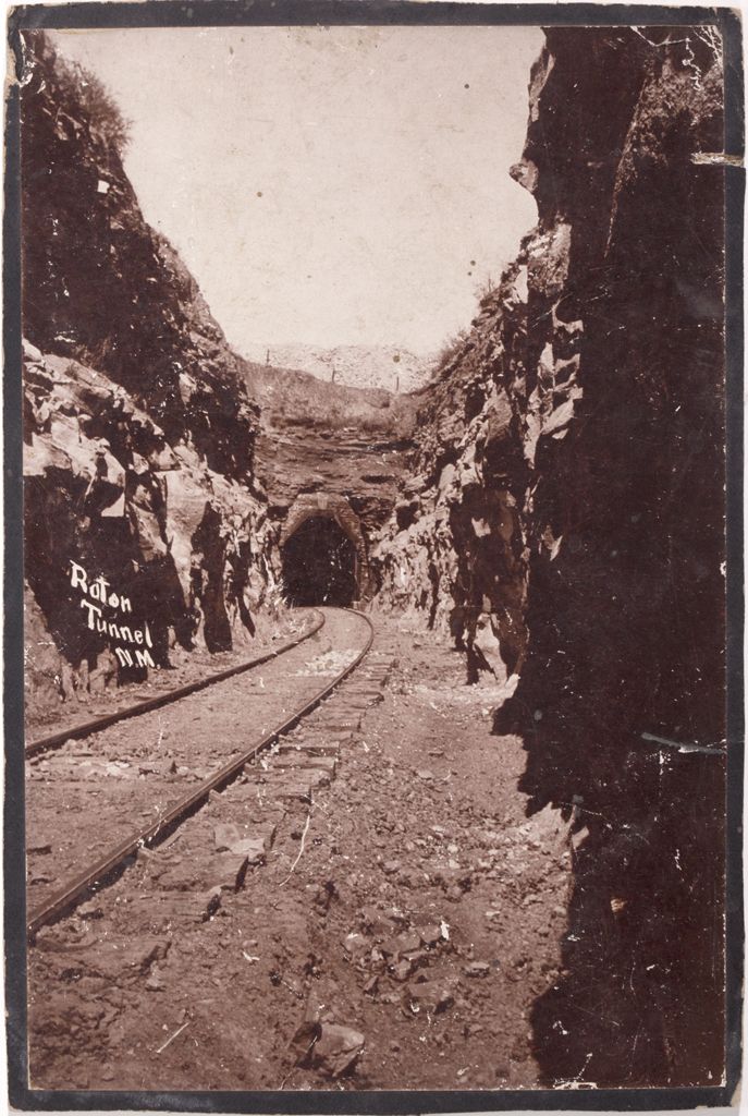 Raton Pass is a mountain pass on the Santa Fe Trail along the Colorado-New Mexico border. The pass is located on the eastern side of the Sangre de Cristo Mountains between Trinidad, Colorado and Raton, New Mexico, approximately 100 miles (160 km) northeast of Santa Fe. The pass crosses the line of volcanic mesas that extends east from the Sangre de Cristo Mountains along the state line, and furnishes the most direct land route between the valley of the Arkansas River to the north and the upper valley of the Canadian River, leading to Santa Fe, to the south. This 4.75" x 7" photograph of Raton Tunnel NM is affixed to black cardstock. -60767