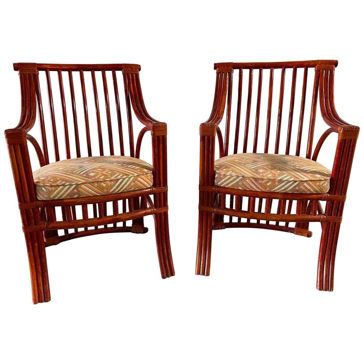 Rattan Wood ArmChair Pair It was created by skilled craftsmen in traditional style with fine handcrafts. the handwork is very fine with incredible detailling. This is a great piece of valuable collection, a valuable personal alter or a very good present. Don't miss out this chance to get it .Good luck to you!