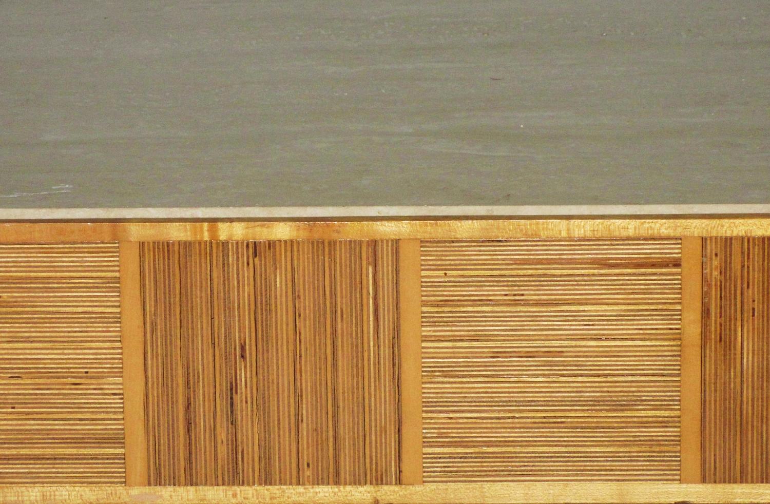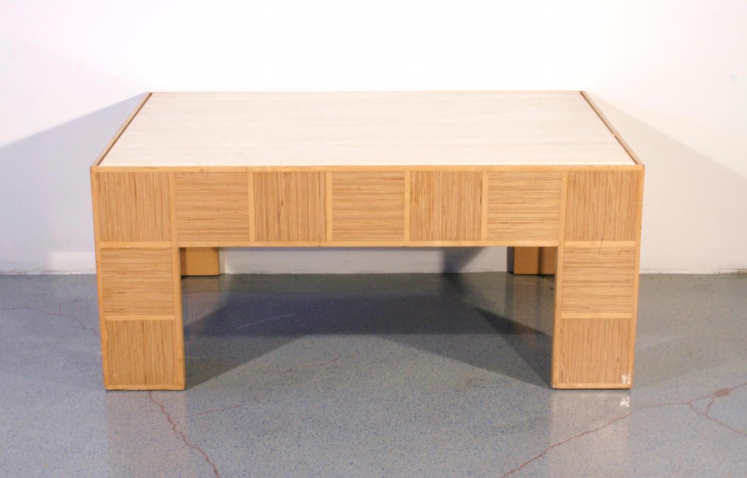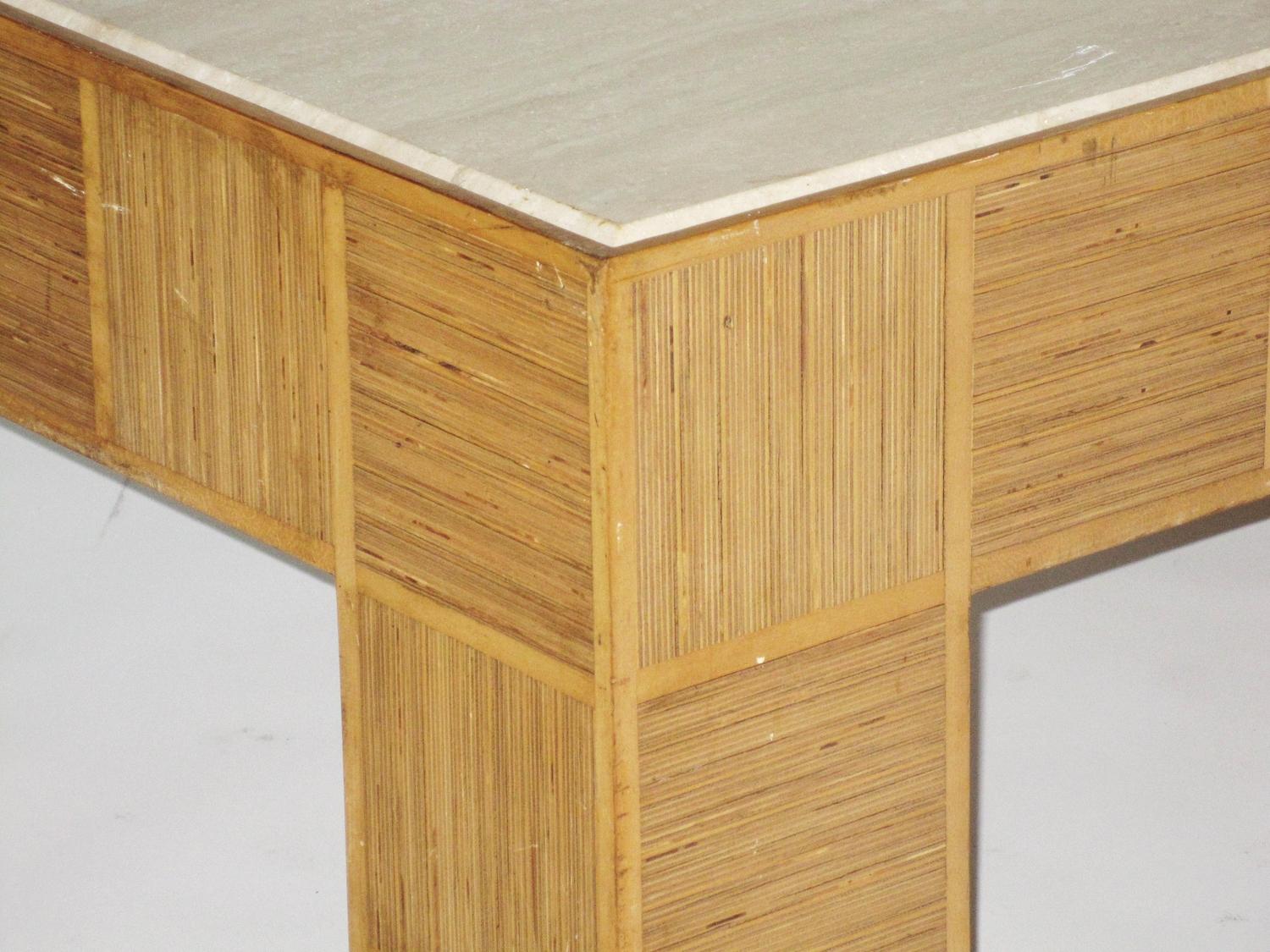 17.5h x 39.5w x 28.5d inches, inlayed bamboo on wooden base, off beige marble