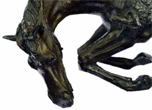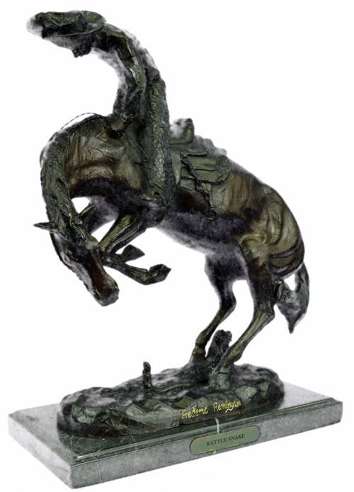 This Bucking Bronco Has Quite Fright Once He Sees A Deadly Rattle Snake Slithering Underneath Him. In A Panic, He Starts To Rear Up And Stomp The Rattlesnake. The Rider Looks Like the Rider from “Wooly Chaps” And Grabs the Reign’s Quick As Lightning And Tries To Regain Control. He Brings His Other Hand Up To The Top Of His Head Keeping His Hat In Place. This Dynamic Achievement Of Action, Danger And Realism Suspended In Motion Is Quite Impressive And Really Ties This Sculpture Together Well. 100% bronze sculpture, this brown patina sculpture was cast using the "lost wax method" and mounted on a black marble base. This sculpture is very interesting a bronze recast based on the original piece. Bronze Dimensions With Marble Base: Height 18 X Width 16 inches. Weight: 20 Lbs.