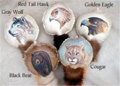 Rawhide rattles measure approx. 12"H x 4½"W and are filled with corn. No maintenance needed! PLEASE NOTE: Salt is used to dry the rawhide. It is normal for salt to continue to shake out of a new rattle. It will eventually shake completely out. Please specify which one at the end of auction thank you. choice are; Grey Wolf,Red Tail Hawk,Golden Eagle, black Bear, and Cougar hand made by myself a Mohawk aboriginal;