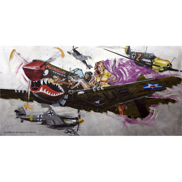 A Unique hand-embellished giclee on canvas featuring a WWII fighter jet by Michael Bryan. It is 20x40" numbered 1/1 w/COA from Artist.