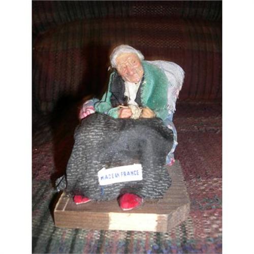 This is a very unusual item. It is a breadcrumb doll. It is an old lady sitting in her chair with her knitting. I'm assuming at one time there was an old man as the wood base has been cut and you only have half of the info on the bottom of the base. The work bread is there and it talks about all the detail for minatures. The Made in France tag is clearly attached to the front of the doll. There is a crack down the face but it's amazing the detail. The head and hands are made of the breadcrumbs. I would have thought it was a type of was actually. I have no other info on this item but do know they are quite rare. If it's something you like, please bid. It is from a smoke free environment. Buyer to pay $10 for U.S. shipping, insurance, and handling. Thanks for viewing.