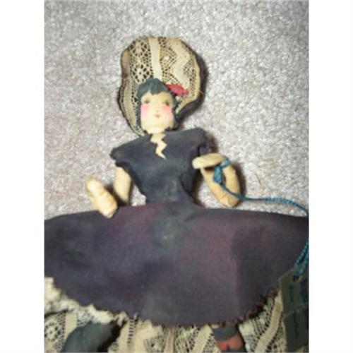 This 6" tall figure was made by Bernard Ravca who was from France. With the stand up hat, she's 6 1/4" tall.The doll came out of his estate. The doll has a silver tag that says Original Ravca Paris- New York and on the back is written B Ravca. She is make out of crepe paper. She has nice facial paint, and the hair is even crepe paper. It's amazing that these crepe paper figures have survived. She's a little dusty and there are a few spots on the taffeta but is still a great example of Ravca's talent. The one leg has at the foot the crepe paper messed up. You may be able to glue it so it will look better. There are even heels on the shoes. She also has red crepe paper around the top of the black legs to be garters. She is from a smoke free environment. Buyer to pay $6 for U.S. shipping, insurance, and handling. Thanks for viewing.