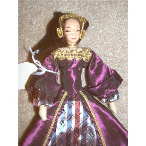 This 8" doll has a papier mache head, made by Bernard Ravca. She is Catherine Parr, one of King Henry's Wives. She has hand painted facial features and brown mohair wig. She comes with her silver paper tag printed in blue, ORIGINAL RAVCA PARIS NEW YORK. She still has her tissue paper under the skirt. There is one tiny pinsize speck of paint off her chin. I said her head is made of papier mache but it could be a combination of substances. It is not cloth. She is elegantly dressed and has not fade, dust or holes.