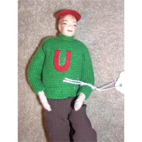 This 8" doll has a papier mache head, made by Bernard Ravca. He has painted features including his hair. He has some holes in his green sweater.He is called a bendable as he is poseable.