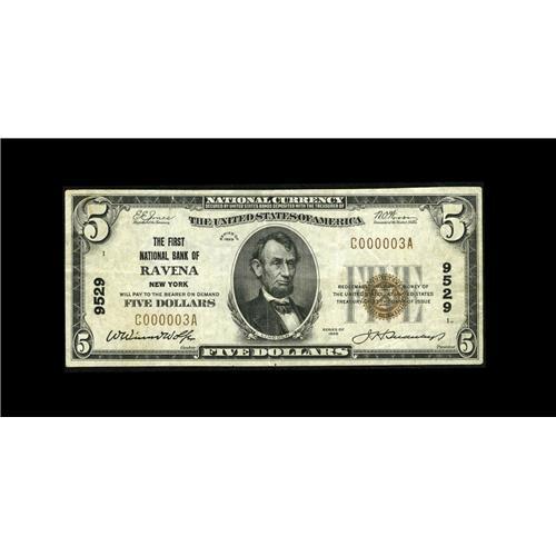 <B>Ravena, NY</B></I> - $5 1929 Ty. 1 <B>The First NB</B></I> Ch. # 9529<BR>An extremely scarce note from the sole bank to issue in this Albany suburb. Bright <B>Very Fine,</B></I> a town missing from even the Sabis collection. This note is new to the census, and the only single-digit number now listed.
