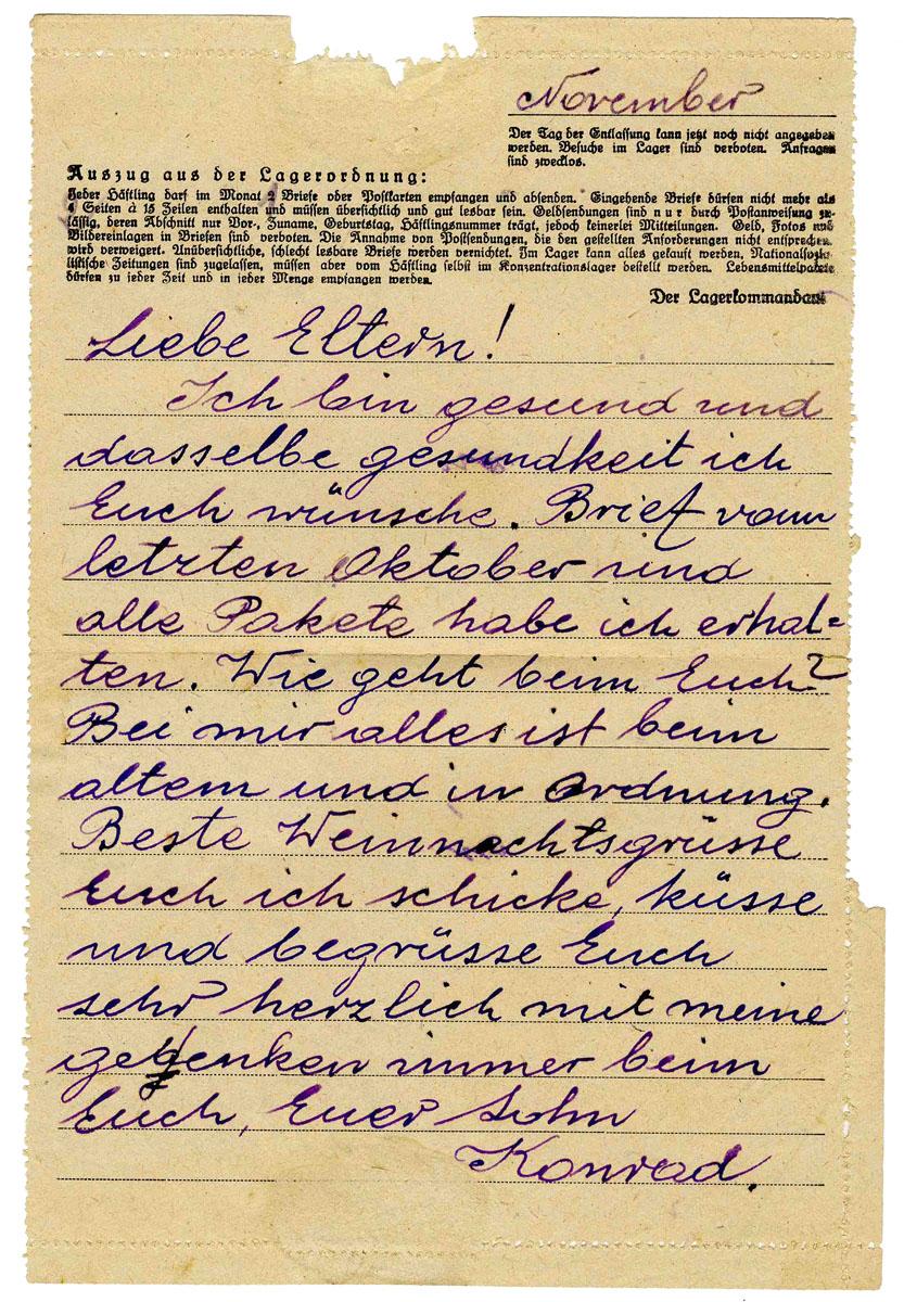 Poignant letter by a Ravensbrueck Concentration Camp inmate named Konrad Kociemski, who was likely in the adjacent men's wing. German letter translates, ''November / Dear Parents! I am healthy and I wish you the same health too. I have received the letter from last Oct as well as all packages…Your son Konrad.'' On official camp stationery, listing rules in German. Single-page letter in purple ink with addresses on verso. Postmarked, though date is illegible, atop stamps of Hitler. 5.25'' x 8.25'' letter is in very good condition.