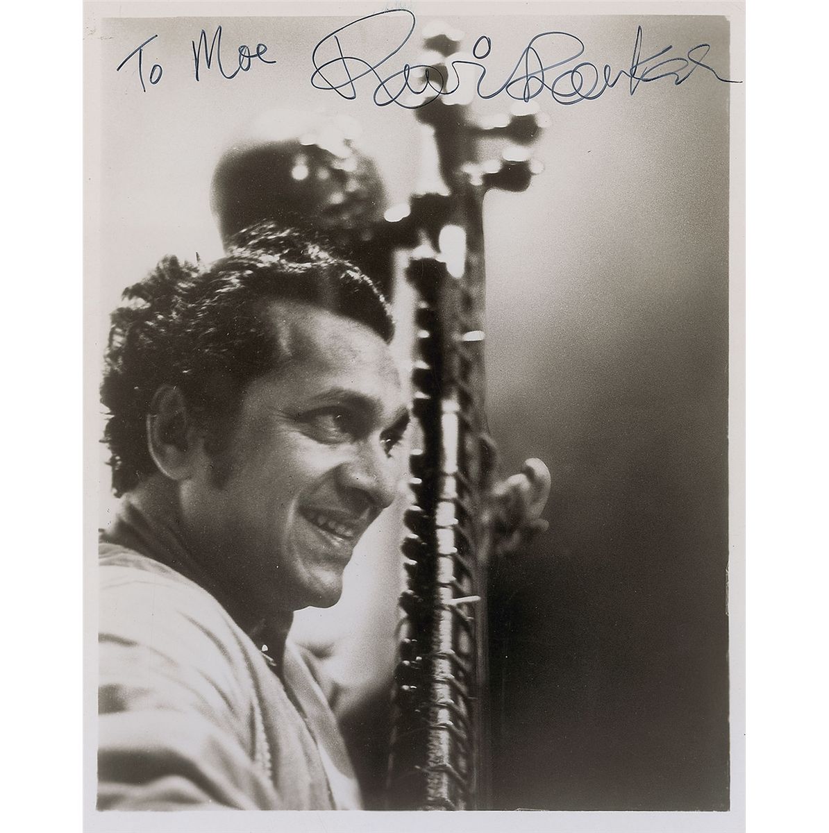 Uncommon glossy 8 x 10 photo of Shankar with his sitar by his side, signed and inscribed in black felt tip, “To Moe, Ravi Shankar.” In fine condition, with subtle brushing to ink.