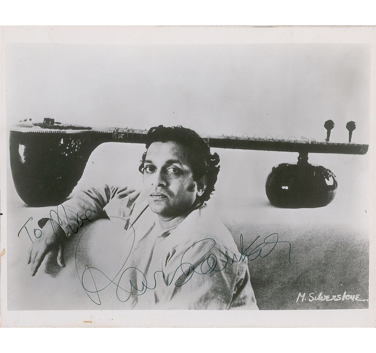 Glossy 10 x 8 photo of Shankar posing in front of his sitar, signed and inscribed in black felt tip, “To Moe, Ravi Shankar.” Affixed to a same-size mount. In fine condition, with adhesive remnants to borders.