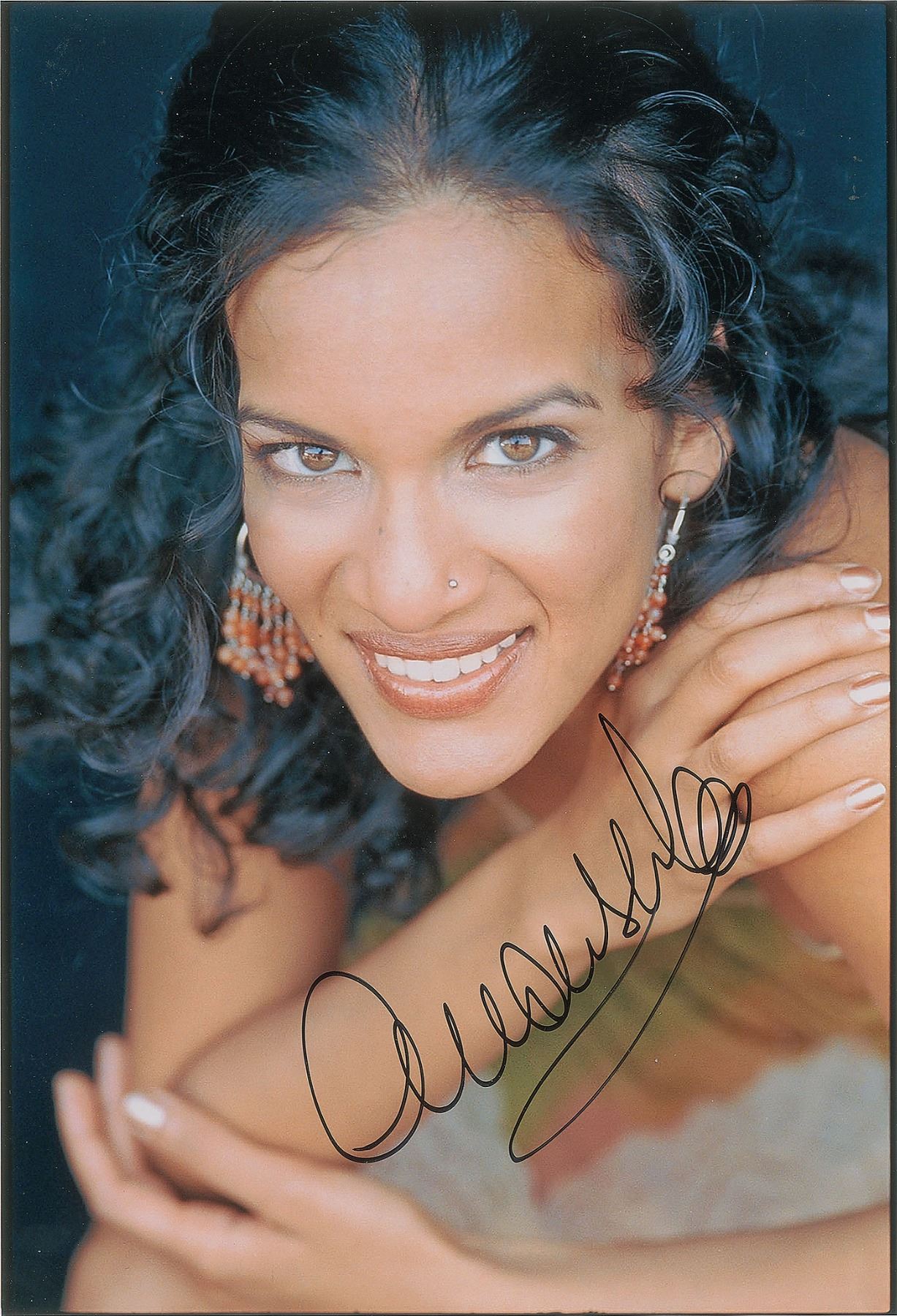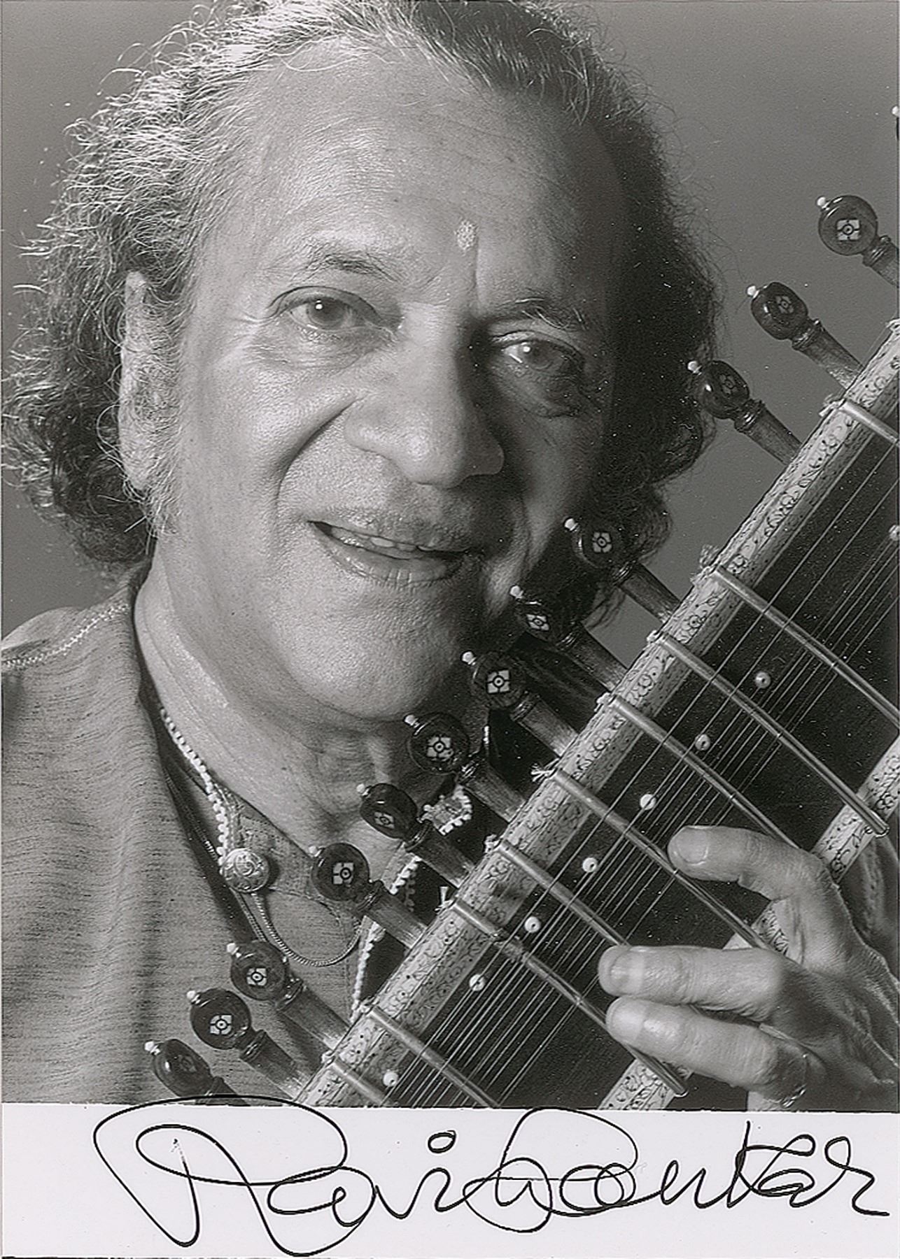 Glossy 5 x 7 close-up photo of Shankar posing with his sitar, signed in the lower border in black ink. In fine condition. Accompanied by a color glossy 8 x 11.75 photo of his daughter Anoushka Shankar, who has signed in black felt tip.