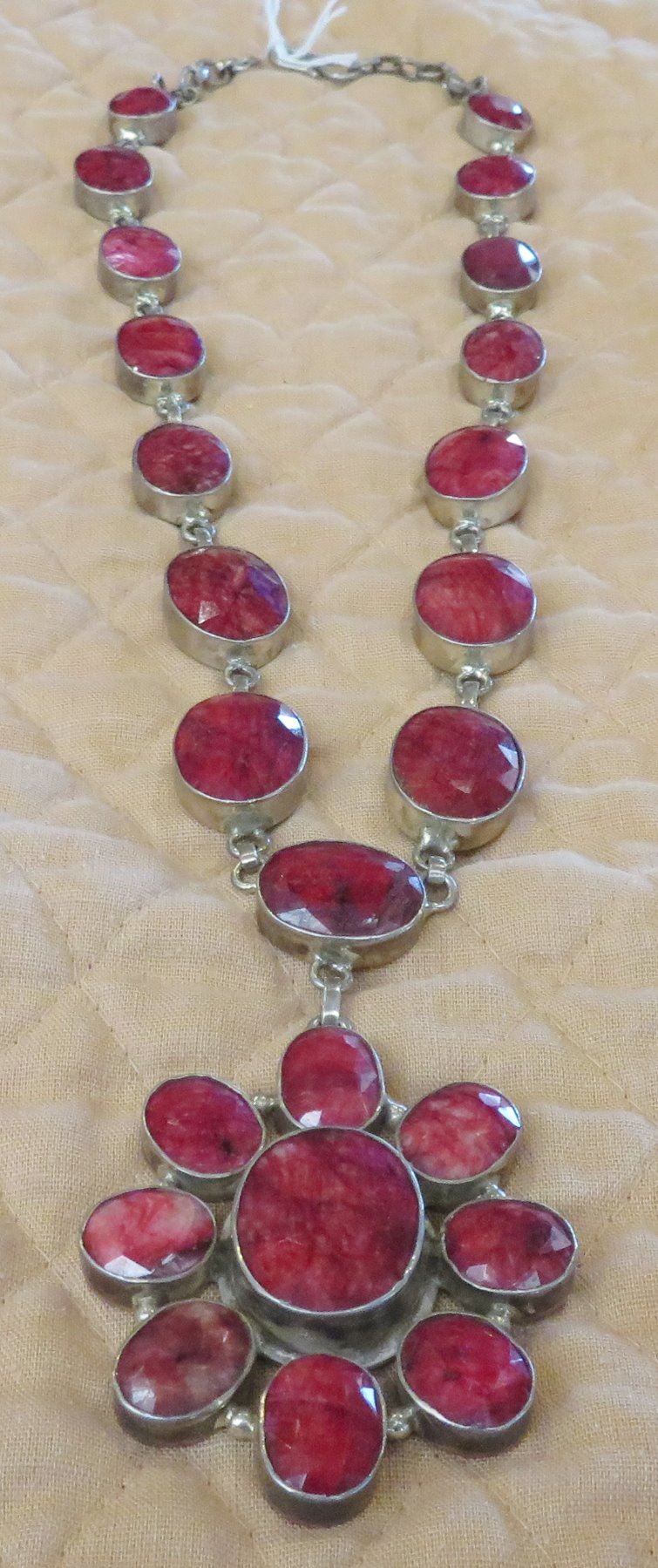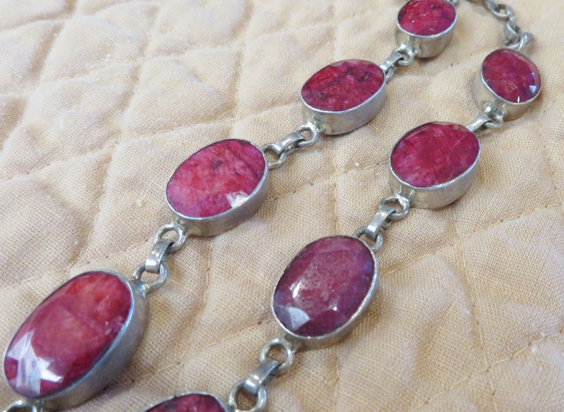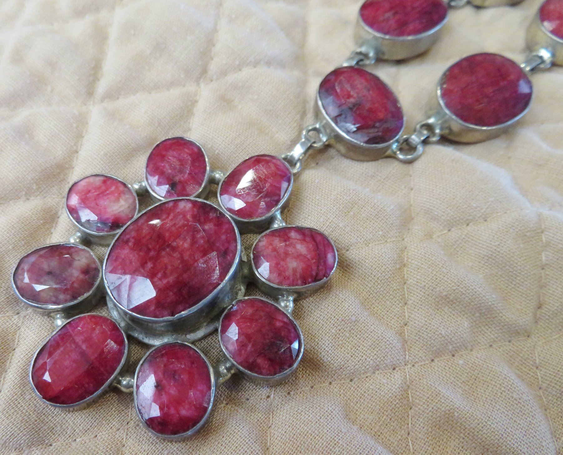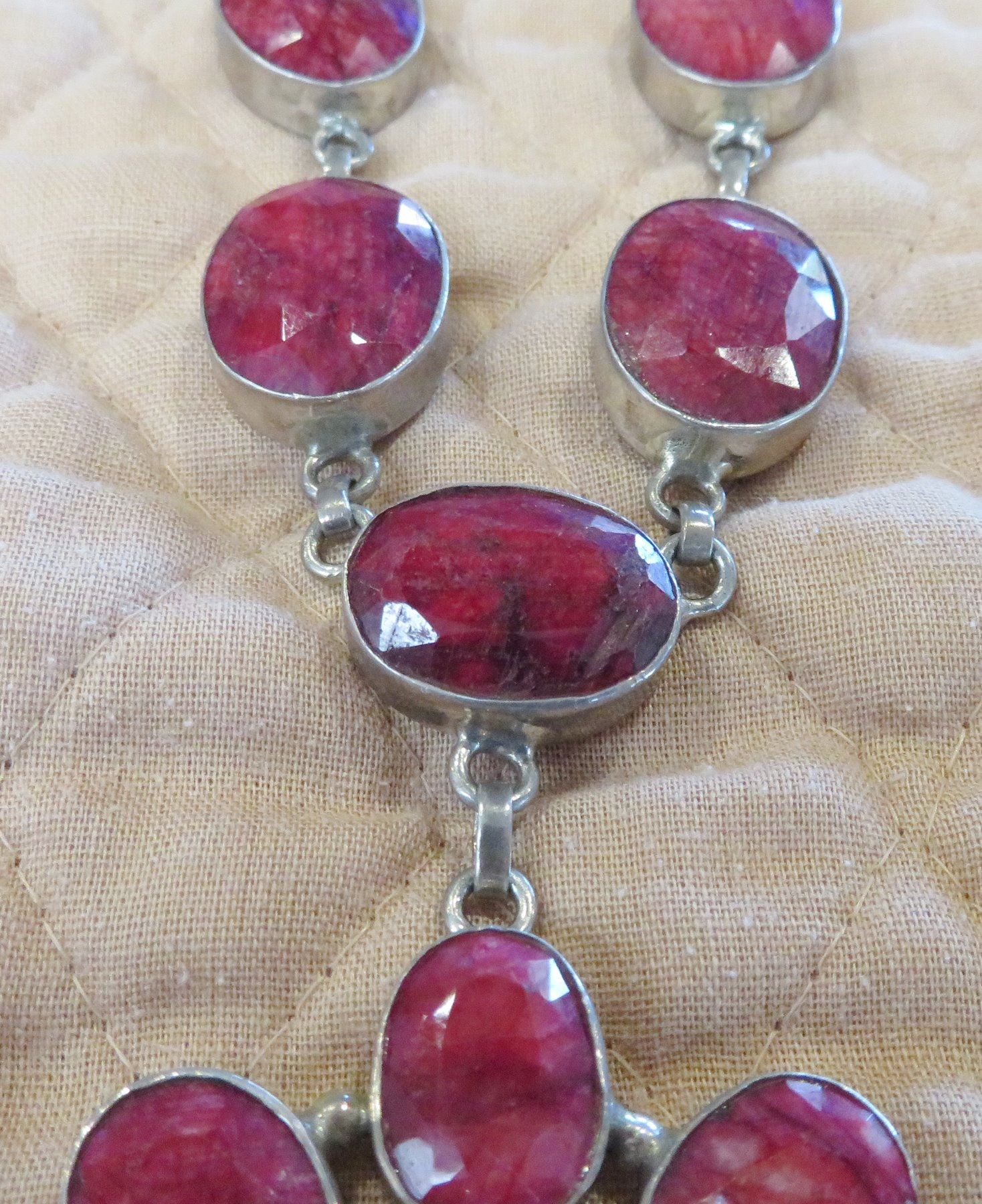 Raw Faceted Ruby Necklace, modern item. Made of raw rubies and sterling silver, the item hangs approx. 12" as worn. Nice holiday gift, 24 cabachons in all, marked .925. Condition: Good, see images. Shipping: $16.50 w/insurance and signature.