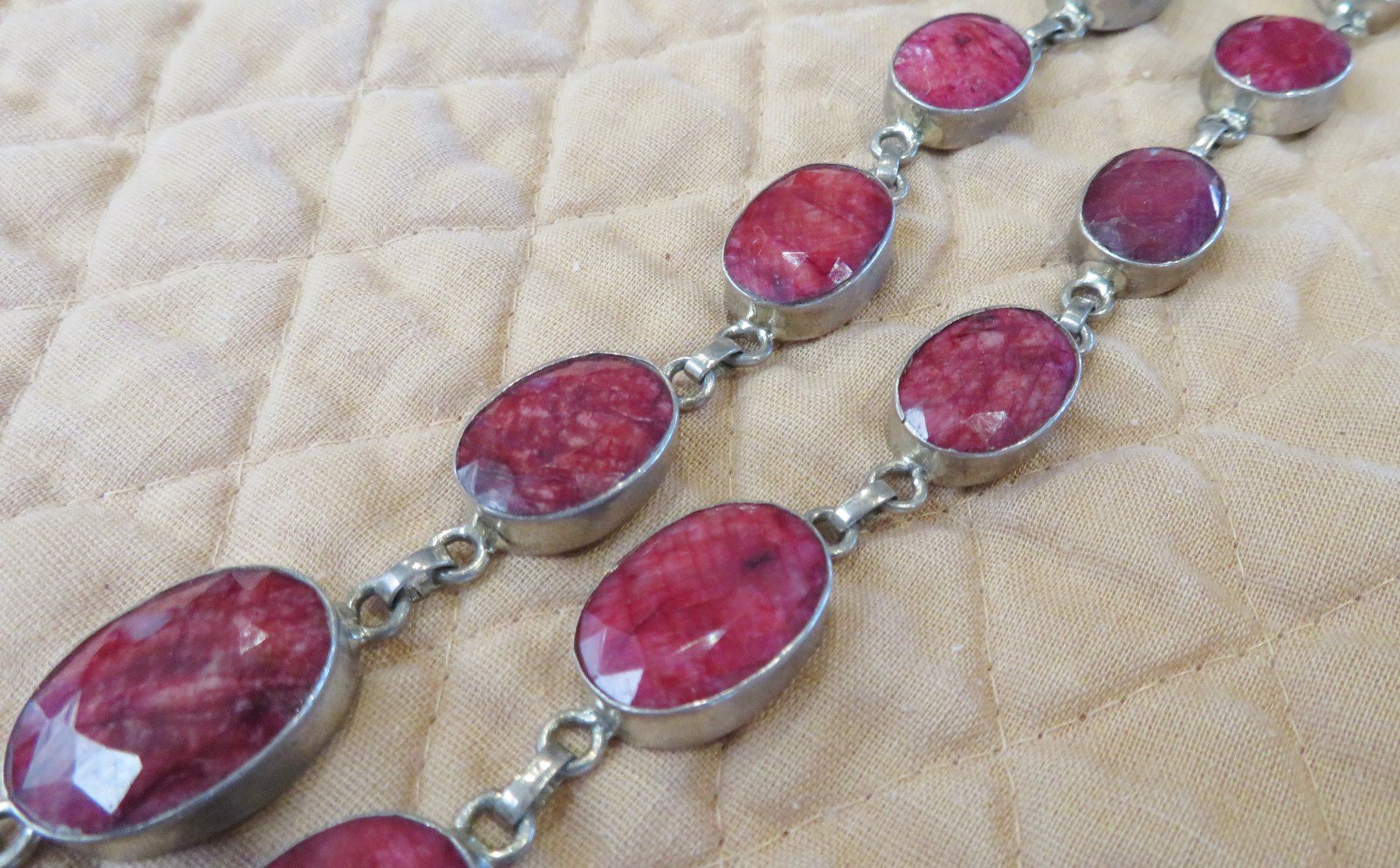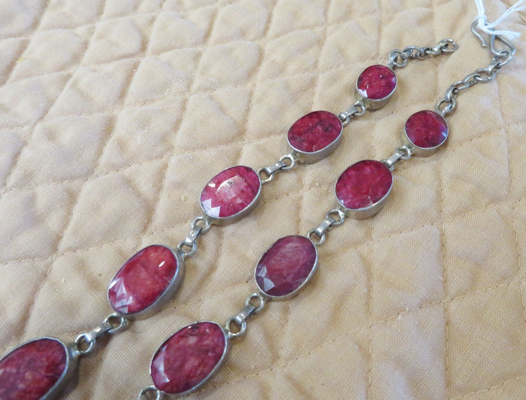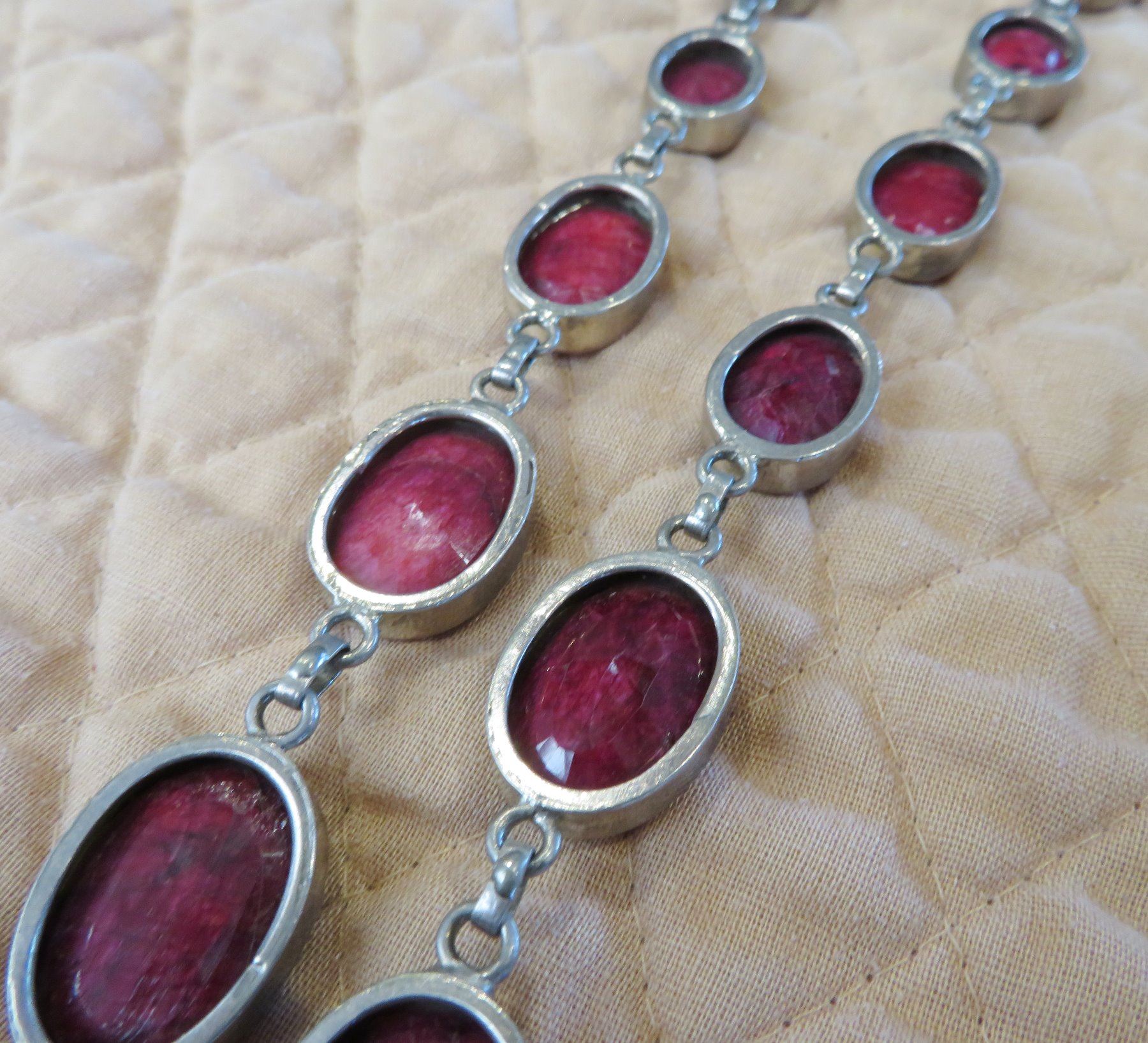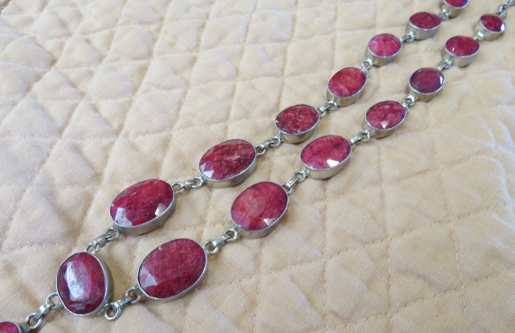 Raw Faceted Ruby Necklace, modern item. Made of raw rubies and sterling silver, the item hangs approx. 12" as worn. Nice holiday gift, 24 cabachons in all, marked .925. Condition: Good, see images. Shipping: $16.50 w/insurance and signature.