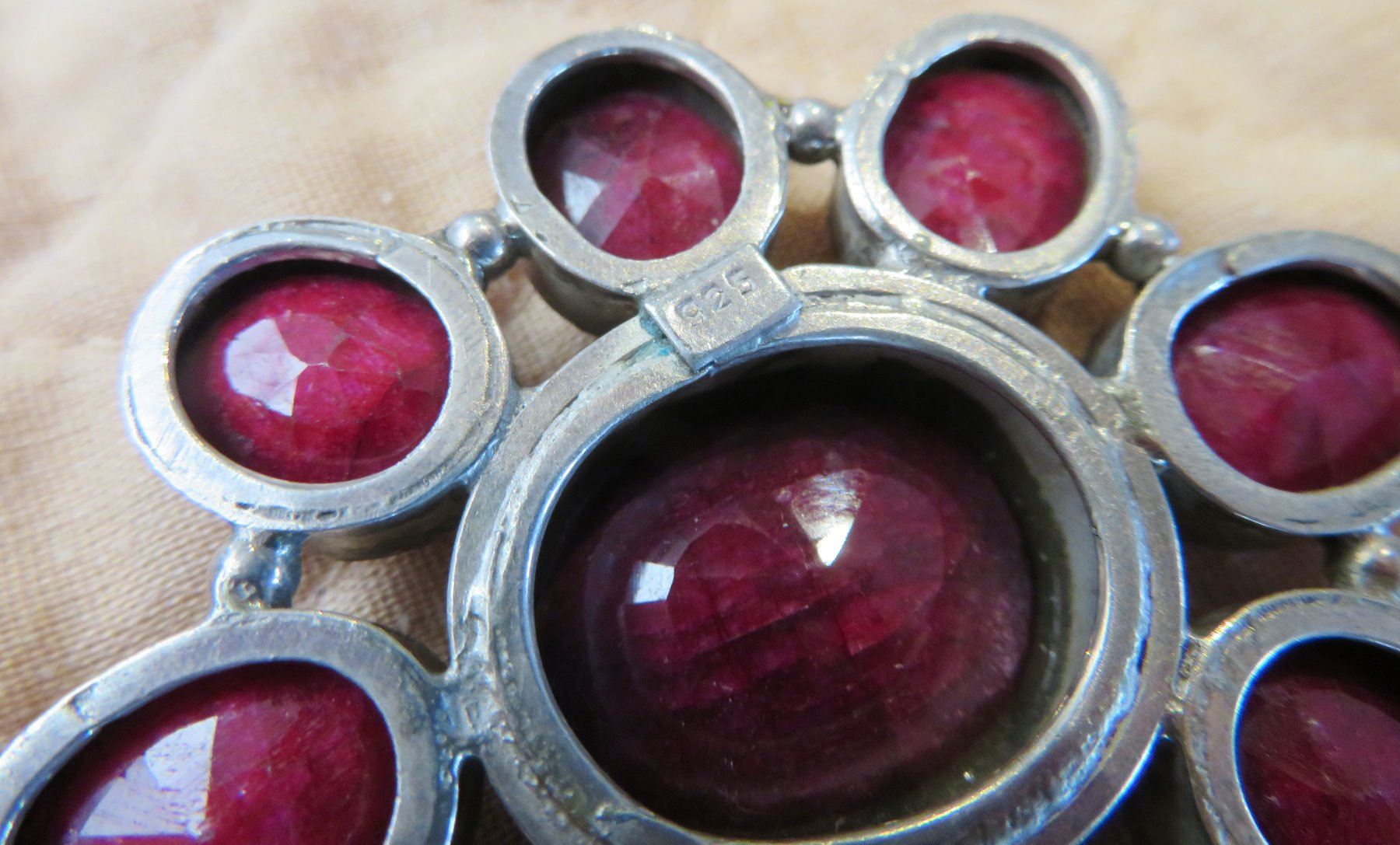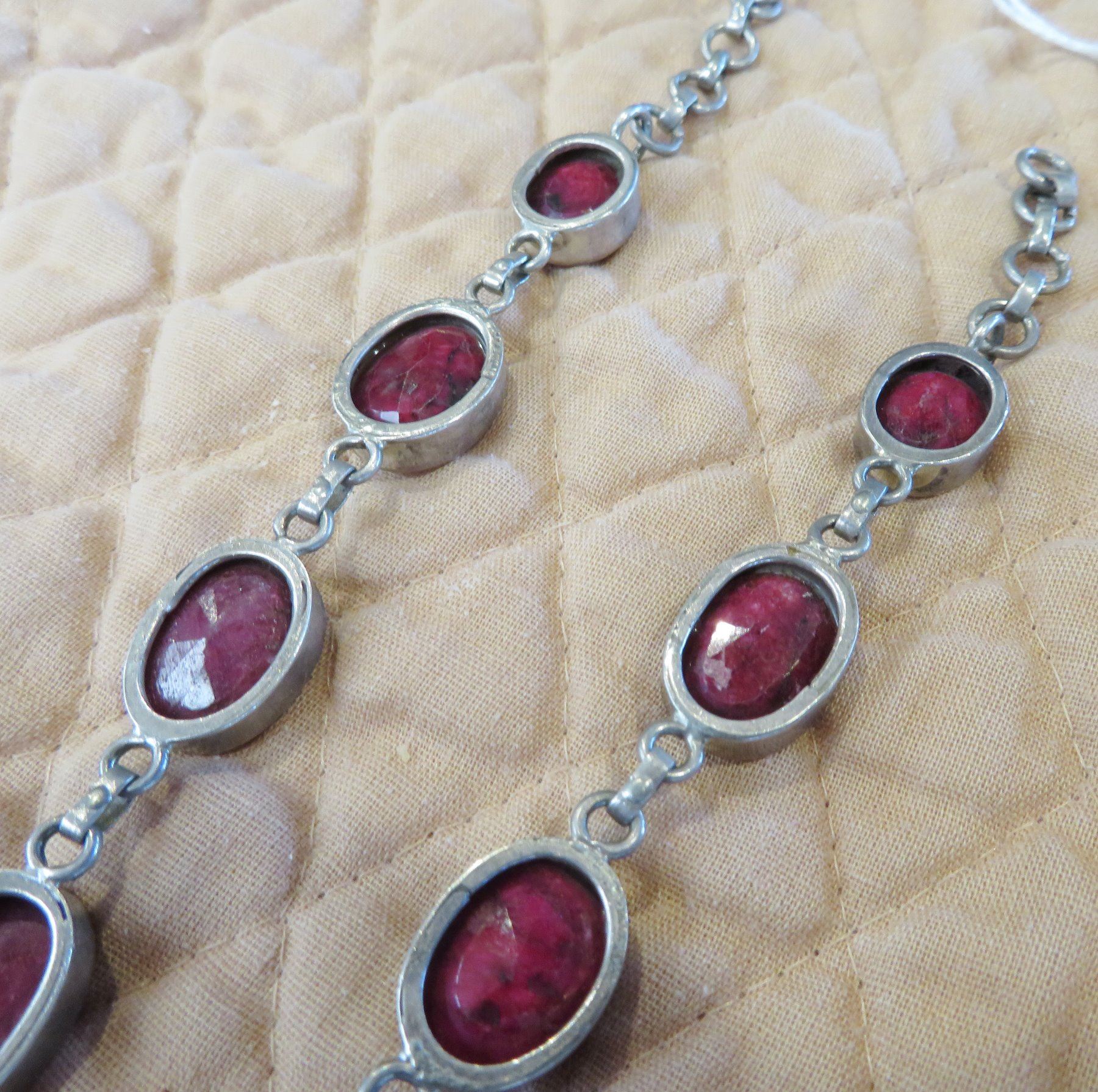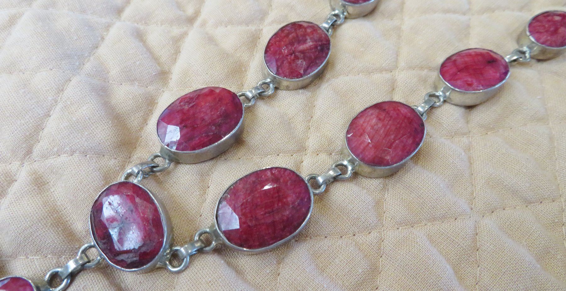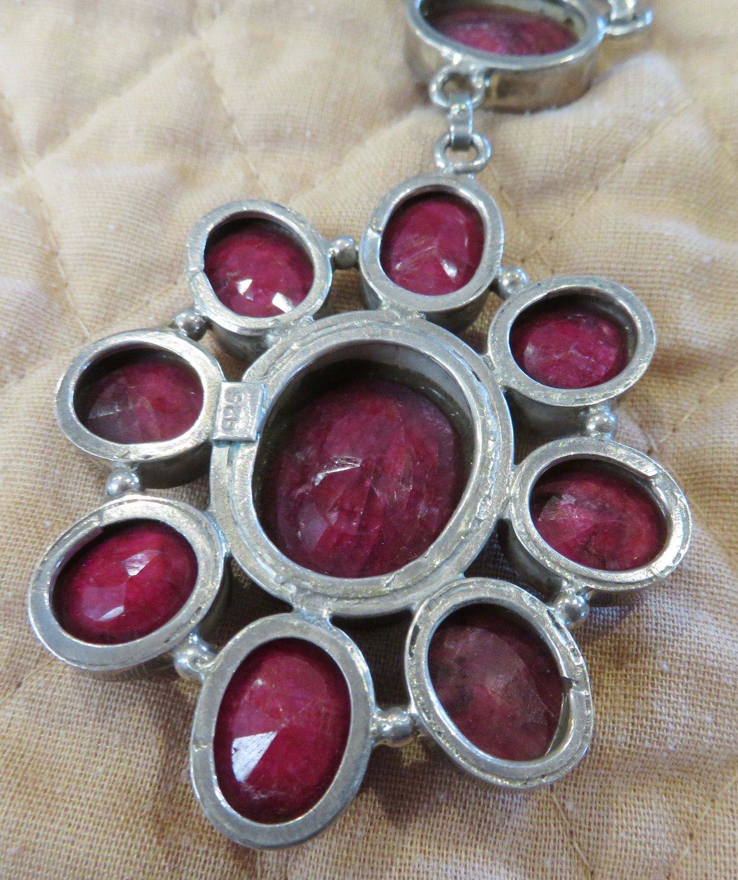Raw Faceted Ruby Necklace, modern item. Made of raw rubies and sterling silver, the item hangs approx. 12" as worn. Nice holiday gift, 24 cabachons in all, marked .925. Condition: Good, see images. Shipping: $16.50 w/insurance and signature.