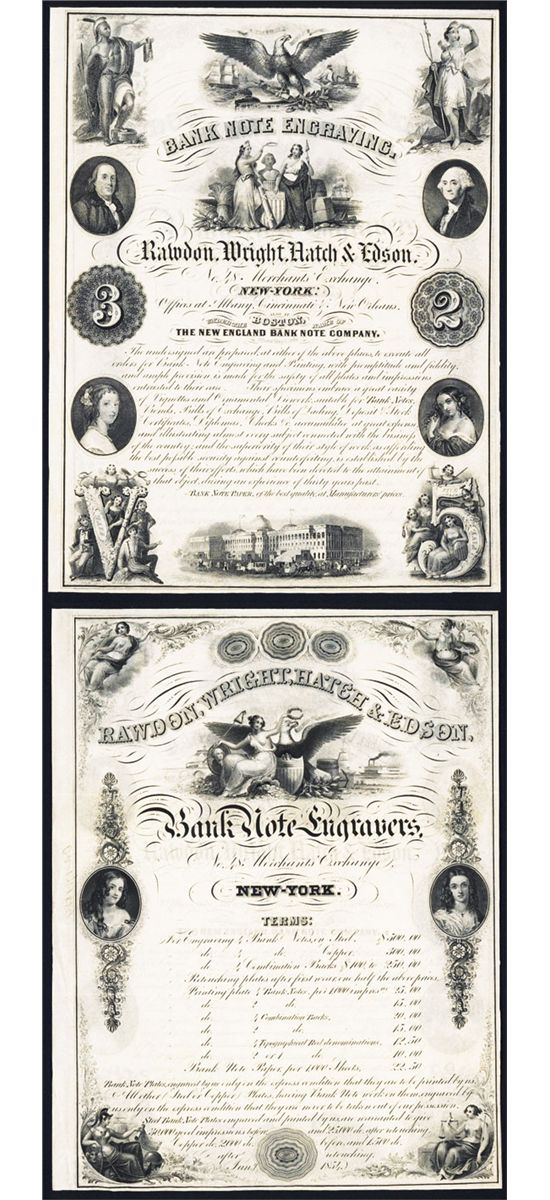 New York; New Orleans; Cincinnati, Boston, 1854, 2 page advertising booklet or broadsides with ornate and detailed vignettes and designs listing information about the company as well as prices for printing banknotes. Young women on left and right with allegorical women in corners with large patriotic eagle and allegorical woman in middle; the second page has portraits of Franklin and Washington, eagle, Native Americans, Numerals with young men and women on bottom corners, large building on bottom. XF condition and a superior example for this issue that is rarely seen this fresh and nice. RWH&E.
