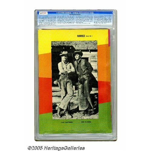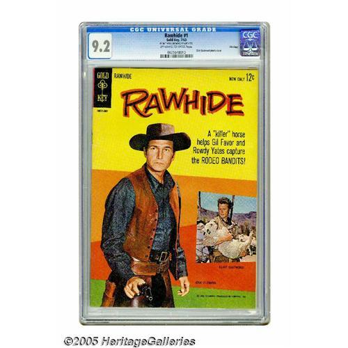 <B>Rawhide #1 File Copy (Gold Key, 1963) CGC NM- 9.2 Off-white to white pages.</B></I> Photo cover featuring Clint Eastwood and Eric Fleming. Overstreet 2005 NM- 9.2 value = $200. CGC census 7/05: 1 in 9.2, none higher. <I>From the Random House Archives.</B></I> <BR><BR><B>Important notice:</B> Heritage usually auctions material at the rate of 200-250 lots per hour. On some occasions eBay Live bid software or the Internet may not be able to keep up with the pace of the auction. We recommend placing a realistic absentee bid now as insurance to avoid disappointment. Occasionally the auctioneer may eliminate or reject an eBay Live bid, and the auctioneer may also reopen a lot after the close of the eBay live bidding (usually because we missed an audience bid), and may reject your bid even if it shows you as the winning bidder. By bidding via eBay Live, you agree that Heritage may award the lot to another bidder at its sole discretion under the circumstances described above or any other reasonable circumstances. Since eBay bids are not shown to us until we open the lot on the floor, we treat those bids just like floor bids. In most cases the floor responds before the eBay bid is presented to us, due to Internet lag time, so for consistency we have made it a policy that floor bids are always considered first over tie eBay live bids. Also please note that all Heritage lots purchased through eBay Live carry a 20% Buyer's Premium. Please make sure you read the Terms and Conditions before you bid. This lot is being auctioned in conjunction with a live floor auction by Heritage Galleries & Auctioneers. All final auction and invoice information will be supplied by Heritage Galleries & Auctioneers, and all other information should be considered preliminary. Lot:3185 <BR><BR><B>Winning Notification and Billing:</B> After the FINAL session in this auction is complete, Heritage will send e-mail and snail mail invoices. This process normally takes several days. All final auction an