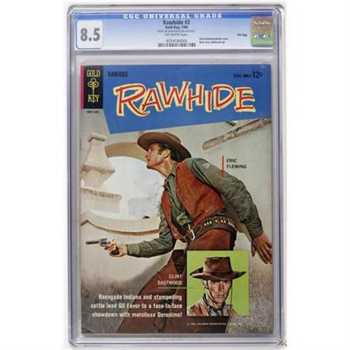 <B>Rawhide #2 File Copy (Gold Key, 1964) CGC VF+ 8.5 Off-white pages.</B></I> Clint Eastwood and Eric Fleming photo cover. Back cover photo pin-up. Overstreet 2007 VF 8.0 value = $87; VF/NM 9.0 value = $144. CGC census 9/07: 2 in 8.5, 6 higher.<BR><BR><b>Shipping:</b> Comics - Slabbed (certified) (<a target="_blank" href="http://www.heritageauctions.com/common/shipping.php">view shipping information</a>)