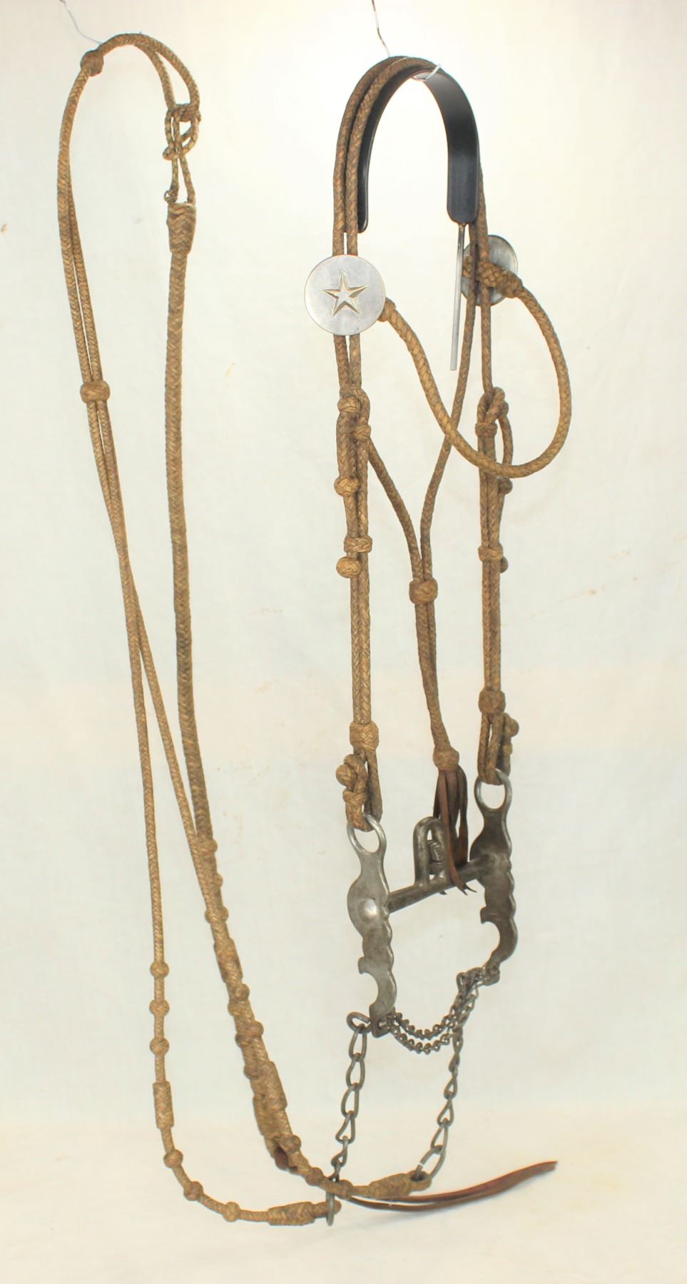 Very nice braided rawhide bridle with many decorative knots, nickel star motif rosettes, well done romel reins, and finished with a extra clean iron Buerman halfbreed bird bit.
