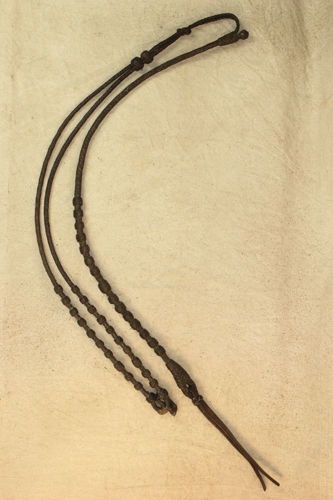 An super nice early pair of braided rawhide reins with 40 braided buttons and original quirt.