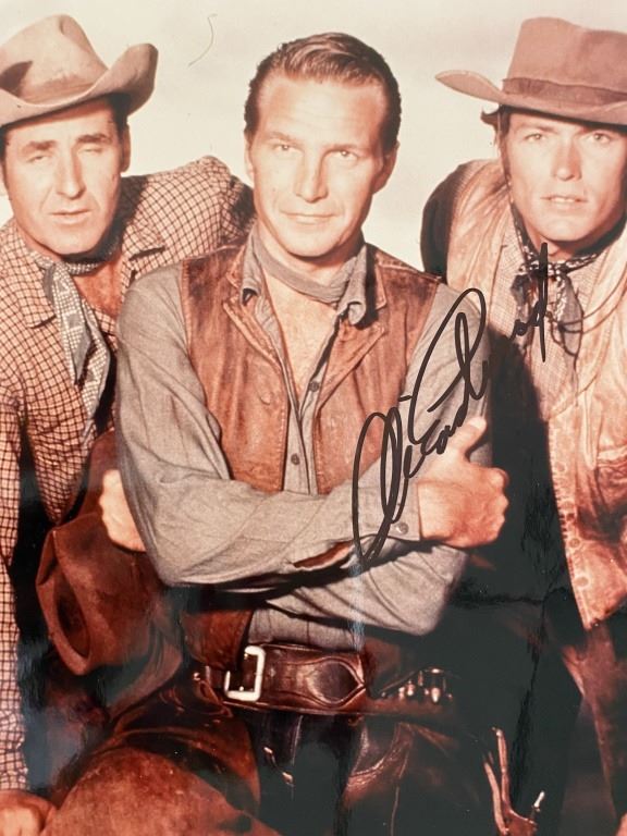 Rawhide Signed Photo Autographed by Clint Eastwood. Measures 8x10 inches. Clint Eastwood's first appearance. Rawhide is an American Western TV series starring Eric Fleming and Clint Eastwood. The show aired for eight seasons on the CBS network on Friday nights, from January 9, 1959, to September 3, 1965, before moving to Tuesday nights from September 14, 1965, until January 4, 1966, with a total of 217 black-and-white episodes. The series was produced and sometimes directed by Charles Marquis Warren, who also produced early episodes of Gunsmoke.