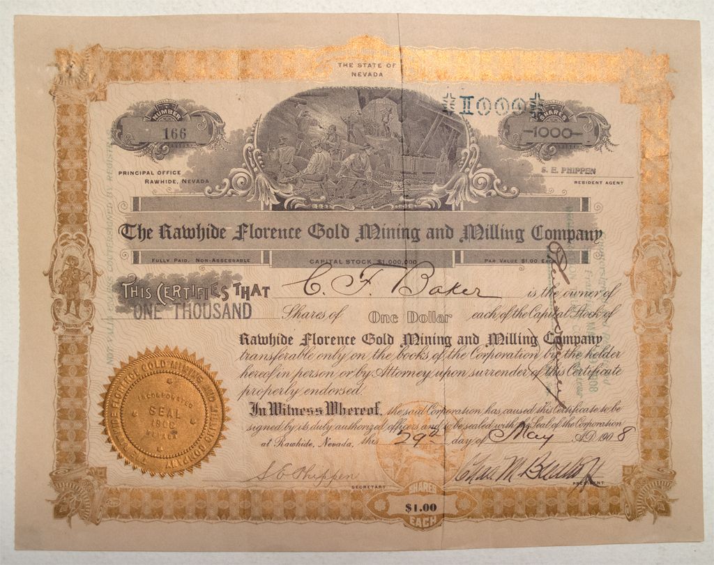 Rare Rawhide stock. #166 for 1,000 shares to C. F. Baker in 1908. Signed by Phippen and Breahoff. Incorporated in 1907.
