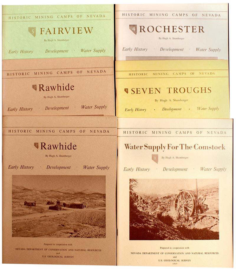 Lot of 19 Historic Mining Camps of Nevada issues; among these issues are Editions 1-5. First of all, there are 4 copies of Edition 1: Water Supply for the Comstock, 1969. 2 copies are signed by author Hugh A. Shamberger. Each is 53 pages, includes a detailed index, and can be identified by its textured tan colored-cover. Second, 5 copies of Edition 2, Rawhide 1970. This edition was dedicated to the still surviving influential members of Rawhide, NV, Charles MCleod (b1878), Leo Grutt (b1879) and Joseph McDonald (b1891. Each copy is a 50 page brown cover colored copy with a printed image of the ghost town of Rawhide. Third, 3 copies of Edition 3: Seven Troughs, 1972. All three of the Seven Troughs copies are signed by author Hugh A. Shamberger; each is 57 pages, includes a detailed index, and has a yellow colored cover with an image of a booming Seven Troughs area. Next, 4 copies of Edition 4: Rochester 1973. Each copy is 65pg, includes an index, and has off-white covers with an image of Rochester. Last, 3 copies are of Edition 5: Fairview 1973. Each has a textured-green cover, has 61 pages and has a detailed index. The lot as a whole is in good condition; there are, however, some slight page discolorations on a minimum number of copies, in addition to small tears along the bindings. All pages and text blocks are near new. All the copies come with fold out maps, printed photos and illustrations, various statistical summaries included.