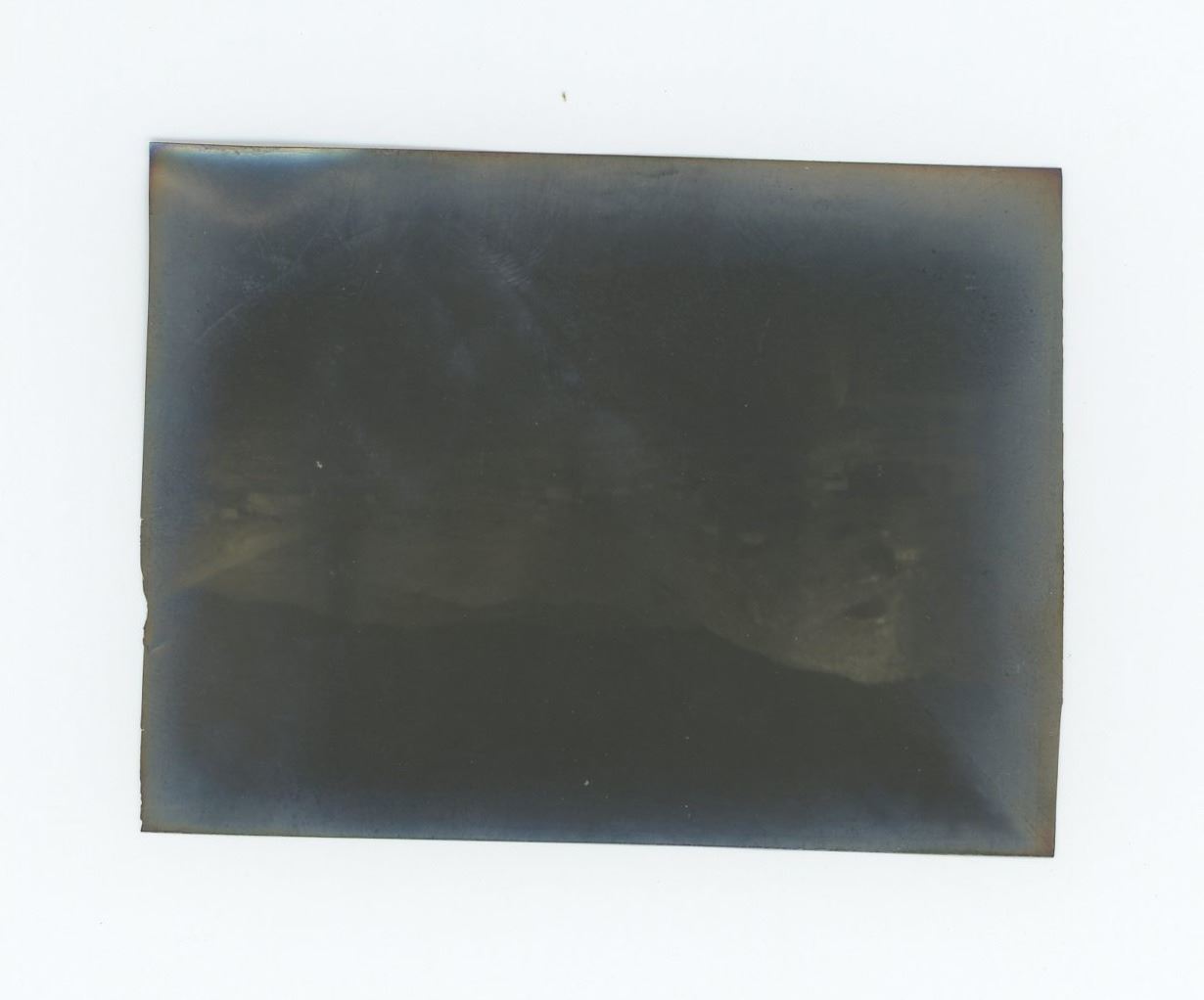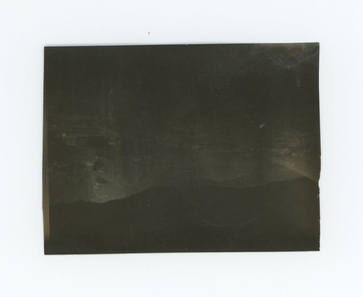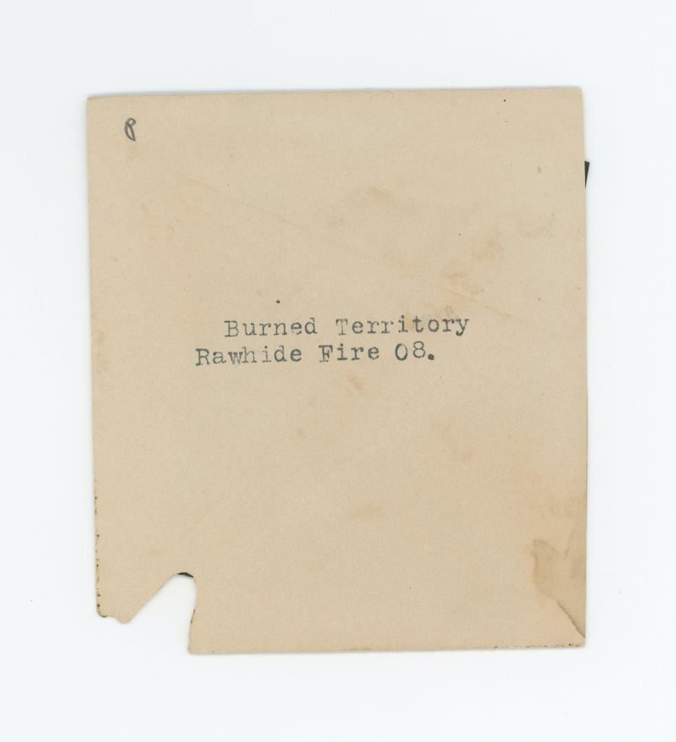 Titled Burned Territory Rawhide 1908 Fire. 3 3/8" by 2 1/4". In December 1906, prospector Jim Swanson made a discovery of a rich gold and silver deposit in the hills near what became Rawhide. He was soon joined by Charles ("Charley") B. Holman and Charles ("Scotty") A. McLeod, who also found sizeable deposits nearby on Hooligan Hill. McLeod had recently been ordered to cease prospecting around the nearby camp of Buckskin, and bitter about this, he suggested the name of Rawhide for the new camp, as a play on the name of the Buckskin camp he held with contempt. Word spread, and both Holman and McLeod sold their claims to investors and moved on to Stingaree Gulch later in 1907, where they found yet another large deposit. The two men sold these claims for even more money, and then left the area to prospect elsewhere. The frenzy that these claims created soon had Rawhide booming. Investors began selling stocks at a frenetic pace, and the town soon had a population of about 5,000, with: three banks, four churches, a school, twelve hotels, twenty-eight restaurants, a theater, and thirty-seven saloons. While the original mines and claims did produce a decent profit in gold and silver, the fever created an amount of activity far in excess of what the mines could support. Stock swindlers like George Graham Rice, a flashy con-artist from Goldfield, plied their trade, creating a sense that Rawhide would be the next Virginia City (or the like of any number of other Nevada boom towns), with untold riches to be had for the savvy folks who would just invest in his companies. Others, like businessman George "Tex" Rickard came to Rawhide to establish legitimate businesses, and make money off the boom while it lasted. Rawhide's hey-day was short-lived; the glaring, gross over-promotion which manipulators performed to inflate the worth of Rawhide doomed its chance for success from the start. In the short span of two years the town went from its peak population of 7,000 people (March to June, 1908), to fewer than 500 people by the latter part of 1910. Helping push the decline of the town even further along was a disastrous fire which swept through Rawhide in September 1908, along with a flood in September 1909, from which many people did not recover or rebuild. While the original mines worked out the last of the gold and silver from the veins first discovered by Swanson, Holman, and McLeod, people began to leave the area, moving to the next "big thing". While there remained a few people eking out a life working in the mines, or processing the ore, or just working their own claims and prospecting, for all intents and purposes the town became a hollow shell of what it once was. The population was 32 in 1940.