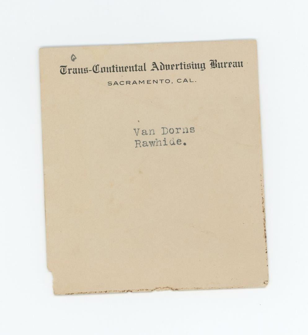 Titled Van Dorn Rawhide. 3 1/8" by 2 3/8" In December 1906, prospector Jim Swanson made a discovery of a rich gold and silver deposit in the hills near what became Rawhide. He was soon joined by Charles ("Charley") B. Holman and Charles ("Scotty") A. McLeod, who also found sizeable deposits nearby on Hooligan Hill. McLeod had recently been ordered to cease prospecting around the nearby camp of Buckskin, and bitter about this, he suggested the name of Rawhide for the new camp, as a play on the name of the Buckskin camp he held with contempt. Word spread, and both Holman and McLeod sold their claims to investors and moved on to Stingaree Gulch later in 1907, where they found yet another large deposit. The two men sold these claims for even more money, and then left the area to prospect elsewhere. The frenzy that these claims created soon had Rawhide booming. Investors began selling stocks at a frenetic pace, and the town soon had a population of about 5,000, with: three banks, four churches, a school, twelve hotels, twenty-eight restaurants, a theater, and thirty-seven saloons. While the original mines and claims did produce a decent profit in gold and silver, the fever created an amount of activity far in excess of what the mines could support. Stock swindlers like George Graham Rice, a flashy con-artist from Goldfield, plied their trade, creating a sense that Rawhide would be the next Virginia City (or the like of any number of other Nevada boom towns), with untold riches to be had for the savvy folks who would just invest in his companies. Others, like businessman George "Tex" Rickard came to Rawhide to establish legitimate businesses, and make money off the boom while it lasted. Rawhide's hey-day was short-lived; the glaring, gross over-promotion which manipulators performed to inflate the worth of Rawhide doomed its chance for success from the start. In the short span of two years the town went from its peak population of 7,000 people (March to June, 1908), to fewer than 500 people by the latter part of 1910. Helping push the decline of the town even further along was a disastrous fire which swept through Rawhide in September 1908, along with a flood in September 1909, from which many people did not recover or rebuild. While the original mines worked out the last of the gold and silver from the veins first discovered by Swanson, Holman, and McLeod, people began to leave the area, moving to the next "big thing". While there remained a few people eking out a life working in the mines, or processing the ore, or just working their own claims and prospecting, for all intents and purposes the town became a hollow shell of what it once was. The population was 32 in 1940.