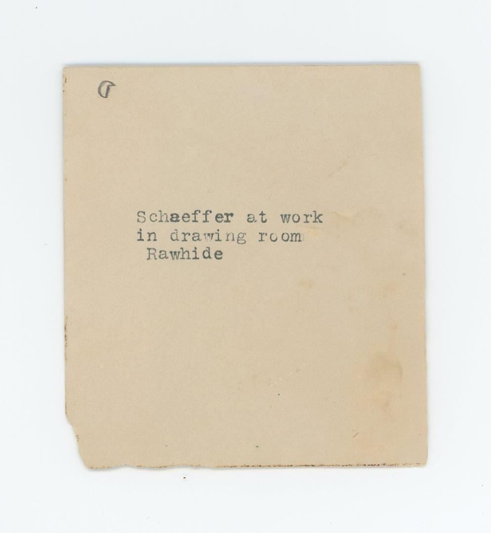 Titled Schaeffer at work in drawing room. Rawhide. 3 3/8" by 2 1/4". In December 1906, prospector Jim Swanson made a discovery of a rich gold and silver deposit in the hills near what became Rawhide. He was soon joined by Charles ("Charley") B. Holman and Charles ("Scotty") A. McLeod, who also found sizeable deposits nearby on Hooligan Hill. McLeod had recently been ordered to cease prospecting around the nearby camp of Buckskin, and bitter about this, he suggested the name of Rawhide for the new camp, as a play on the name of the Buckskin camp he held with contempt. Word spread, and both Holman and McLeod sold their claims to investors and moved on to Stingaree Gulch later in 1907, where they found yet another large deposit. The two men sold these claims for even more money, and then left the area to prospect elsewhere. The frenzy that these claims created soon had Rawhide booming. Investors began selling stocks at a frenetic pace, and the town soon had a population of about 5,000, with: three banks, four churches, a school, twelve hotels, twenty-eight restaurants, a theater, and thirty-seven saloons. While the original mines and claims did produce a decent profit in gold and silver, the fever created an amount of activity far in excess of what the mines could support. Stock swindlers like George Graham Rice, a flashy con-artist from Goldfield, plied their trade, creating a sense that Rawhide would be the next Virginia City (or the like of any number of other Nevada boom towns), with untold riches to be had for the savvy folks who would just invest in his companies. Others, like businessman George "Tex" Rickard came to Rawhide to establish legitimate businesses, and make money off the boom while it lasted. Rawhide's hey-day was short-lived; the glaring, gross over-promotion which manipulators performed to inflate the worth of Rawhide doomed its chance for success from the start. In the short span of two years the town went from its peak population of 7,000 people (March to June, 1908), to fewer than 500 people by the latter part of 1910. Helping push the decline of the town even further along was a disastrous fire which swept through Rawhide in September 1908, along with a flood in September 1909, from which many people did not recover or rebuild. While the original mines worked out the last of the gold and silver from the veins first discovered by Swanson, Holman, and McLeod, people began to leave the area, moving to the next "big thing". While there remained a few people eking out a life working in the mines, or processing the ore, or just working their own claims and prospecting, for all intents and purposes the town became a hollow shell of what it once was. The population was 32 in 1940.