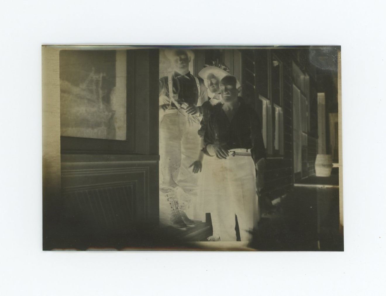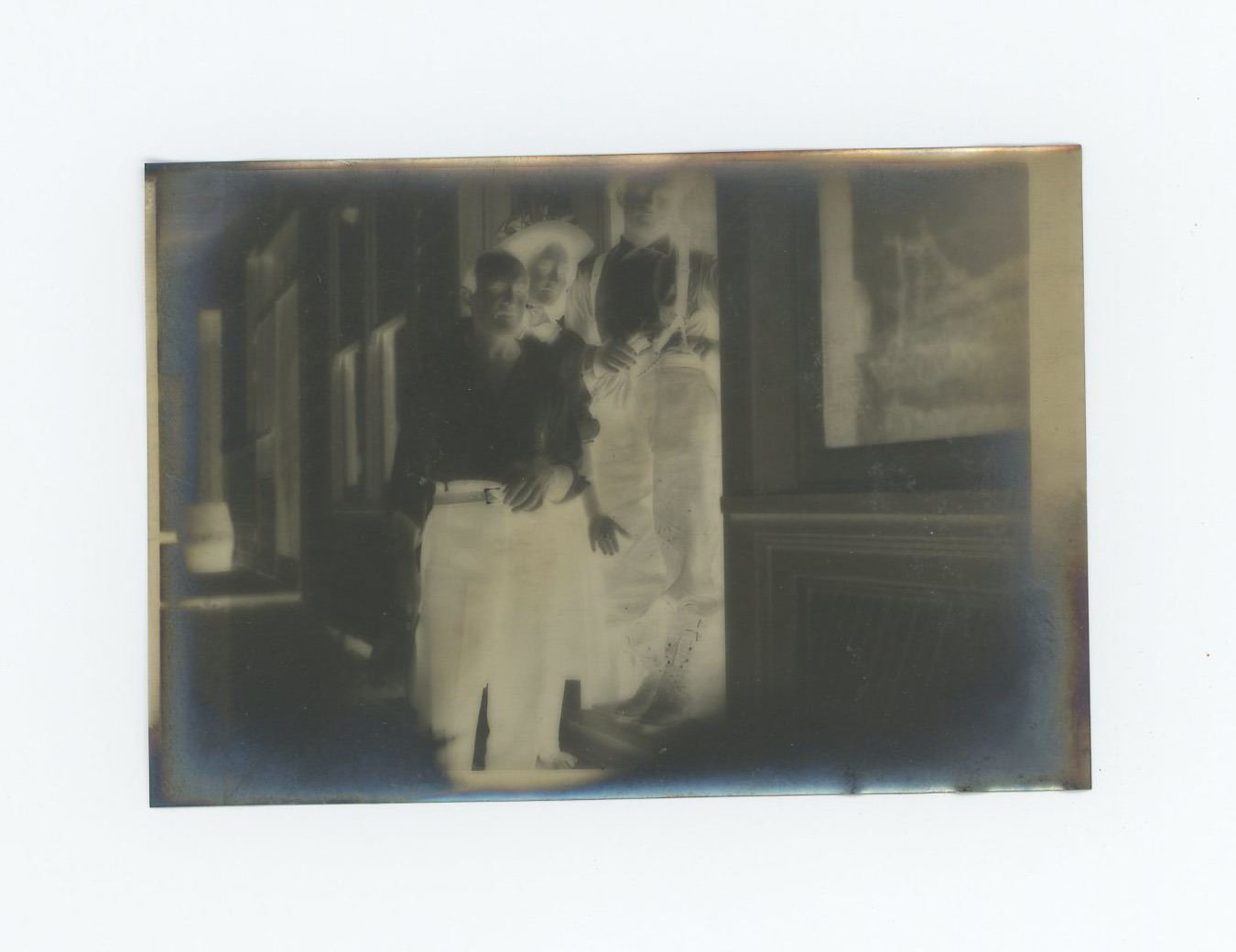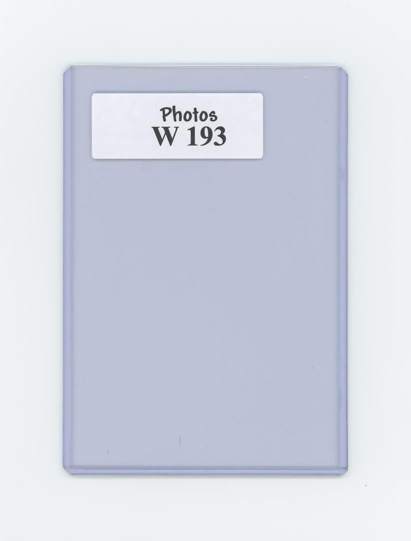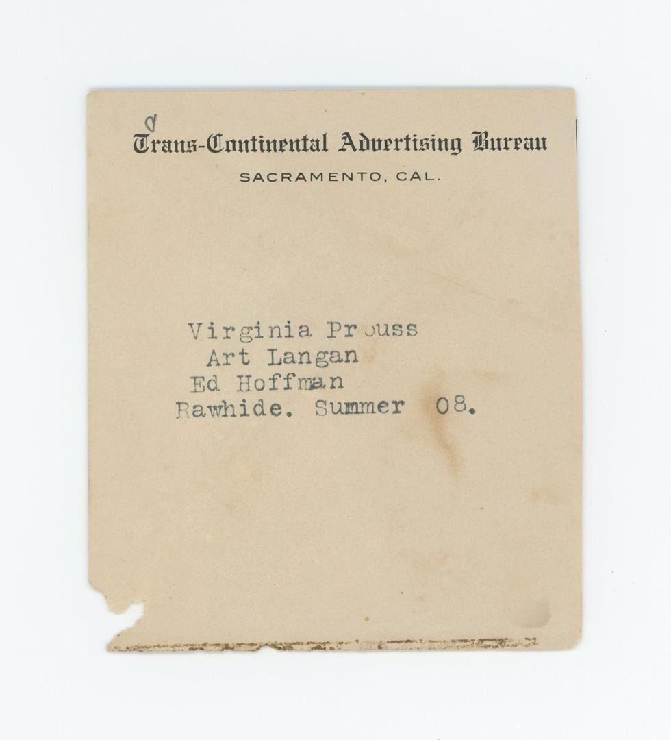 Title is Virginia Prouss, Art Langan, Ed Hoffman. Rawhide. Summer 08. 3 3/8" by 2 1/4" In December 1906, prospector Jim Swanson made a discovery of a rich gold and silver deposit in the hills near what became Rawhide. He was soon joined by Charles ("Charley") B. Holman and Charles ("Scotty") A. McLeod, who also found sizeable deposits nearby on Hooligan Hill. McLeod had recently been ordered to cease prospecting around the nearby camp of Buckskin, and bitter about this, he suggested the name of Rawhide for the new camp, as a play on the name of the Buckskin camp he held with contempt. Word spread, and both Holman and McLeod sold their claims to investors and moved on to Stingaree Gulch later in 1907, where they found yet another large deposit. The two men sold these claims for even more money, and then left the area to prospect elsewhere. The frenzy that these claims created soon had Rawhide booming. Investors began selling stocks at a frenetic pace, and the town soon had a population of about 5,000, with: three banks, four churches, a school, twelve hotels, twenty-eight restaurants, a theater, and thirty-seven saloons. While the original mines and claims did produce a decent profit in gold and silver, the fever created an amount of activity far in excess of what the mines could support. Stock swindlers like George Graham Rice, a flashy con-artist from Goldfield, plied their trade, creating a sense that Rawhide would be the next Virginia City (or the like of any number of other Nevada boom towns), with untold riches to be had for the savvy folks who would just invest in his companies. Others, like businessman George "Tex" Rickard came to Rawhide to establish legitimate businesses, and make money off the boom while it lasted. Rawhide's hey-day was short-lived; the glaring, gross over-promotion which manipulators performed to inflate the worth of Rawhide doomed its chance for success from the start. In the short span of two years the town went from its peak population of 7,000 people (March to June, 1908), to fewer than 500 people by the latter part of 1910. Helping push the decline of the town even further along was a disastrous fire which swept through Rawhide in September 1908, along with a flood in September 1909, from which many people did not recover or rebuild. While the original mines worked out the last of the gold and silver from the veins first discovered by Swanson, Holman, and McLeod, people began to leave the area, moving to the next "big thing". While there remained a few people eking out a life working in the mines, or processing the ore, or just working their own claims and prospecting, for all intents and purposes the town became a hollow shell of what it once was. The population was 32 in 1940.