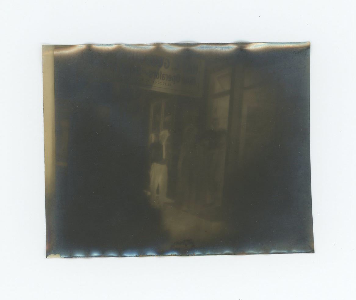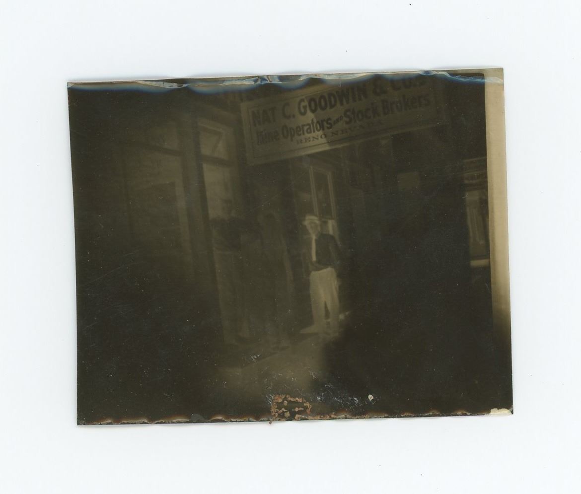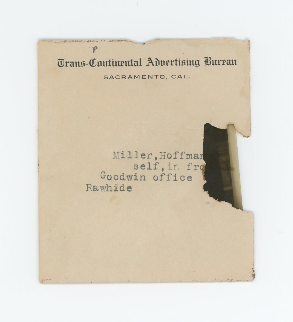 Titled Miller, Hoffman, and self in front of Goodwin office. Rawhide. 2 7/8" by 2 1/4" In December 1906, prospector Jim Swanson made a discovery of a rich gold and silver deposit in the hills near what became Rawhide. He was soon joined by Charles ("Charley") B. Holman and Charles ("Scotty") A. McLeod, who also found sizeable deposits nearby on Hooligan Hill. McLeod had recently been ordered to cease prospecting around the nearby camp of Buckskin, and bitter about this, he suggested the name of Rawhide for the new camp, as a play on the name of the Buckskin camp he held with contempt. Word spread, and both Holman and McLeod sold their claims to investors and moved on to Stingaree Gulch later in 1907, where they found yet another large deposit. The two men sold these claims for even more money, and then left the area to prospect elsewhere. The frenzy that these claims created soon had Rawhide booming. Investors began selling stocks at a frenetic pace, and the town soon had a population of about 5,000, with: three banks, four churches, a school, twelve hotels, twenty-eight restaurants, a theater, and thirty-seven saloons. While the original mines and claims did produce a decent profit in gold and silver, the fever created an amount of activity far in excess of what the mines could support. Stock swindlers like George Graham Rice, a flashy con-artist from Goldfield, plied their trade, creating a sense that Rawhide would be the next Virginia City (or the like of any number of other Nevada boom towns), with untold riches to be had for the savvy folks who would just invest in his companies. Others, like businessman George "Tex" Rickard came to Rawhide to establish legitimate businesses, and make money off the boom while it lasted. Rawhide's hey-day was short-lived; the glaring, gross over-promotion which manipulators performed to inflate the worth of Rawhide doomed its chance for success from the start. In the short span of two years the town went from its peak population of 7,000 people (March to June, 1908), to fewer than 500 people by the latter part of 1910. Helping push the decline of the town even further along was a disastrous fire which swept through Rawhide in September 1908, along with a flood in September 1909, from which many people did not recover or rebuild. While the original mines worked out the last of the gold and silver from the veins first discovered by Swanson, Holman, and McLeod, people began to leave the area, moving to the next "big thing". While there remained a few people eking out a life working in the mines, or processing the ore, or just working their own claims and prospecting, for all intents and purposes the town became a hollow shell of what it once was. The population was 32 in 1940.