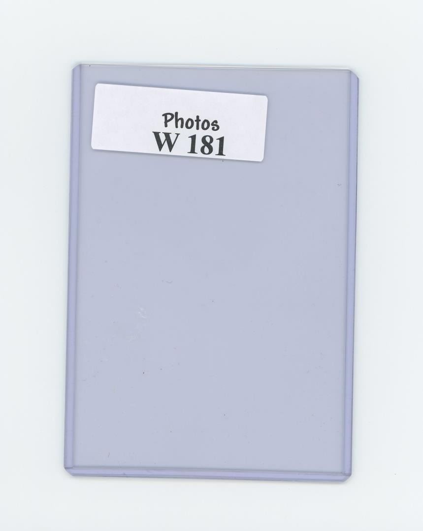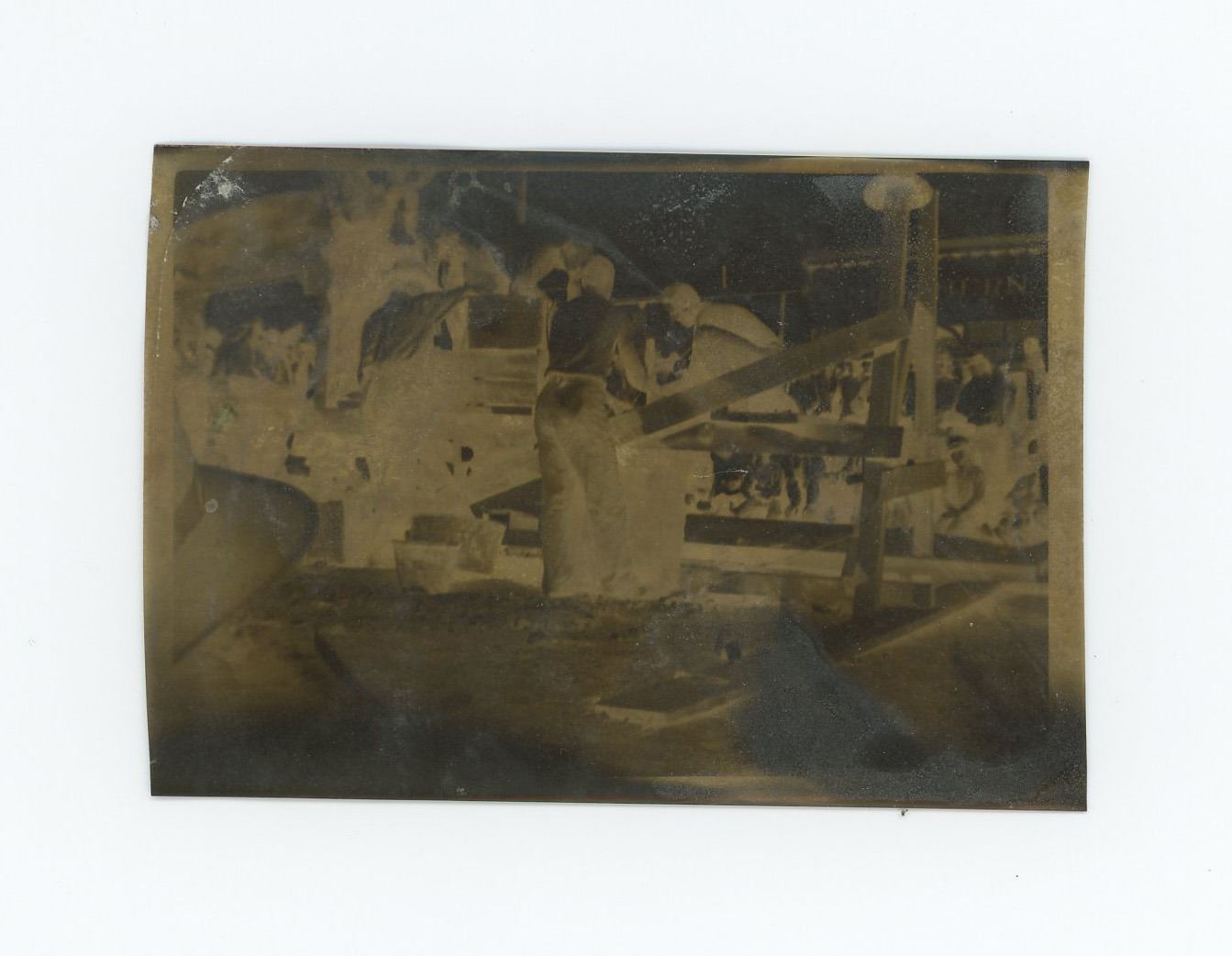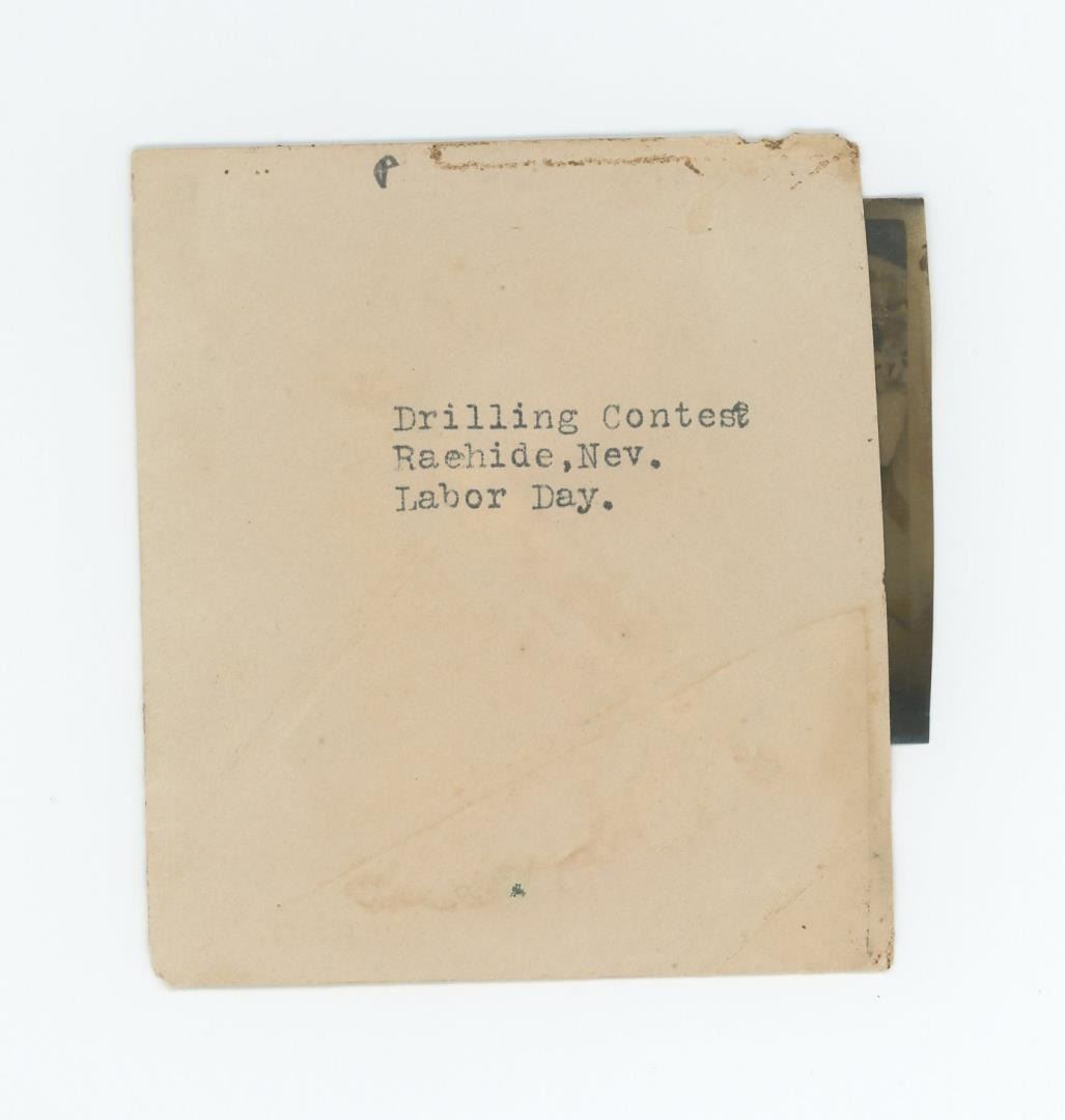 Labor day drilling contest photo negative. 3 3/8" by 2 3/8". In December 1906, prospector Jim Swanson made a discovery of a rich gold and silver deposit in the hills near what became Rawhide. He was soon joined by Charles ("Charley") B. Holman and Charles ("Scotty") A. McLeod, who also found sizeable deposits nearby on Hooligan Hill. McLeod had recently been ordered to cease prospecting around the nearby camp of Buckskin, and bitter about this, he suggested the name of Rawhide for the new camp, as a play on the name of the Buckskin camp he held with contempt. Word spread, and both Holman and McLeod sold their claims to investors and moved on to Stingaree Gulch later in 1907, where they found yet another large deposit. The two men sold these claims for even more money, and then left the area to prospect elsewhere. The frenzy that these claims created soon had Rawhide booming. Investors began selling stocks at a frenetic pace, and the town soon had a population of about 5,000, with: three banks, four churches, a school, twelve hotels, twenty-eight restaurants, a theater, and thirty-seven saloons. While the original mines and claims did produce a decent profit in gold and silver, the fever created an amount of activity far in excess of what the mines could support. Stock swindlers like George Graham Rice, a flashy con-artist from Goldfield, plied their trade, creating a sense that Rawhide would be the next Virginia City (or the like of any number of other Nevada boom towns), with untold riches to be had for the savvy folks who would just invest in his companies. Others, like businessman George "Tex" Rickard came to Rawhide to establish legitimate businesses, and make money off the boom while it lasted. Rawhide's hey-day was short-lived; the glaring, gross over-promotion which manipulators performed to inflate the worth of Rawhide doomed its chance for success from the start. In the short span of two years the town went from its peak population of 7,000 people (March to June, 1908), to fewer than 500 people by the latter part of 1910. Helping push the decline of the town even further along was a disastrous fire which swept through Rawhide in September 1908, along with a flood in September 1909, from which many people did not recover or rebuild. While the original mines worked out the last of the gold and silver from the veins first discovered by Swanson, Holman, and McLeod, people began to leave the area, moving to the next "big thing". While there remained a few people eking out a life working in the mines, or processing the ore, or just working their own claims and prospecting, for all intents and purposes the town became a hollow shell of what it once was. The population was 32 in 1940.