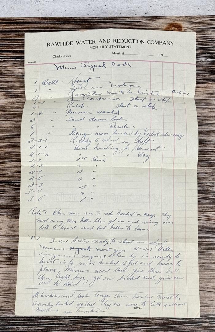 This bill head from the Nevada ghost town of Rawhide has a copy of the signal code from one of the mines. In December 1906, prospector Jim Swanson made a discovery of a rich gold and silver deposit in the hills near what became Rawhide. He was soon joined by Charles ("Charley") B. Holman and Charles ("Scotty") A. McLeod, who also found sizeable deposits nearby on Hooligan Hill. McLeod had recently been ordered to cease prospecting around the nearby camp of Buckskin, and bitter about this, he suggested the name of Rawhide for the new camp, as a play on the name of the Buckskin camp he held with contempt. Word spread, and both Holman and McLeod sold their claims to investors and moved on to Stingaree Gulch later in 1907, where they found yet another large deposit. The two men sold these claims for even more money, and then left the area to prospect elsewhere. The frenzy that these claims created soon had Rawhide booming. Investors began selling stocks at a frenetic pace, and the town soon had a population of about 5,000, with: three banks, four churches, a school, twelve hotels, twenty-eight restaurants, a theater, and thirty-seven saloons. While the original mines and claims did produce a decent profit in gold and silver, the fever created an amount of activity far in excess of what the mines could support. Stock swindlers like George Graham Rice, a flashy con-artist from Goldfield, plied their trade, creating a sense that Rawhide would be the next Virginia City (or the like of any number of other Nevada boom towns), with untold riches to be had for the savvy folks who would just invest in his companies. Others, like businessman George "Tex" Rickard came to Rawhide to establish legitimate businesses, and make money off the boom while it lasted. Rawhide's hey-day was short-lived; the glaring, gross over-promotion which manipulators performed to inflate the worth of Rawhide doomed its chance for success from the start. In the short span of two years the town went from its peak population of 7,000 people (March to June, 1908), to fewer than 500 people by the latter part of 1910. Helping push the decline of the town even further along was a disastrous fire which swept through Rawhide in September 1908, along with a flood in September 1909, from which many people did not recover or rebuild. While the original mines worked out the last of the gold and silver from the veins first discovered by Swanson, Holman, and McLeod, people began to leave the area, moving to the next "big thing". While there remained a few people eking out a life working in the mines, or processing the ore, or just working their own claims and prospecting, for all intents and purposes the town became a hollow shell of what it once was. The population was 32 in 1940.