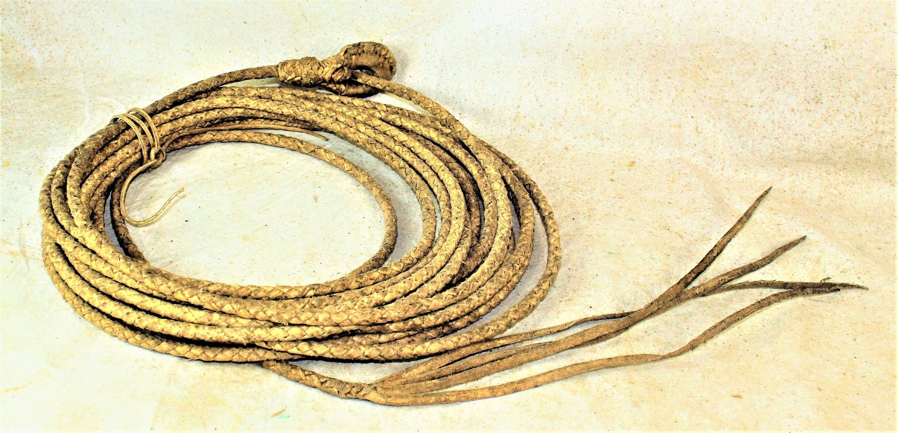 Nice clean four strand rawhide rope with attractive hondo and end tails, measuring approximately 40 ft. in length.