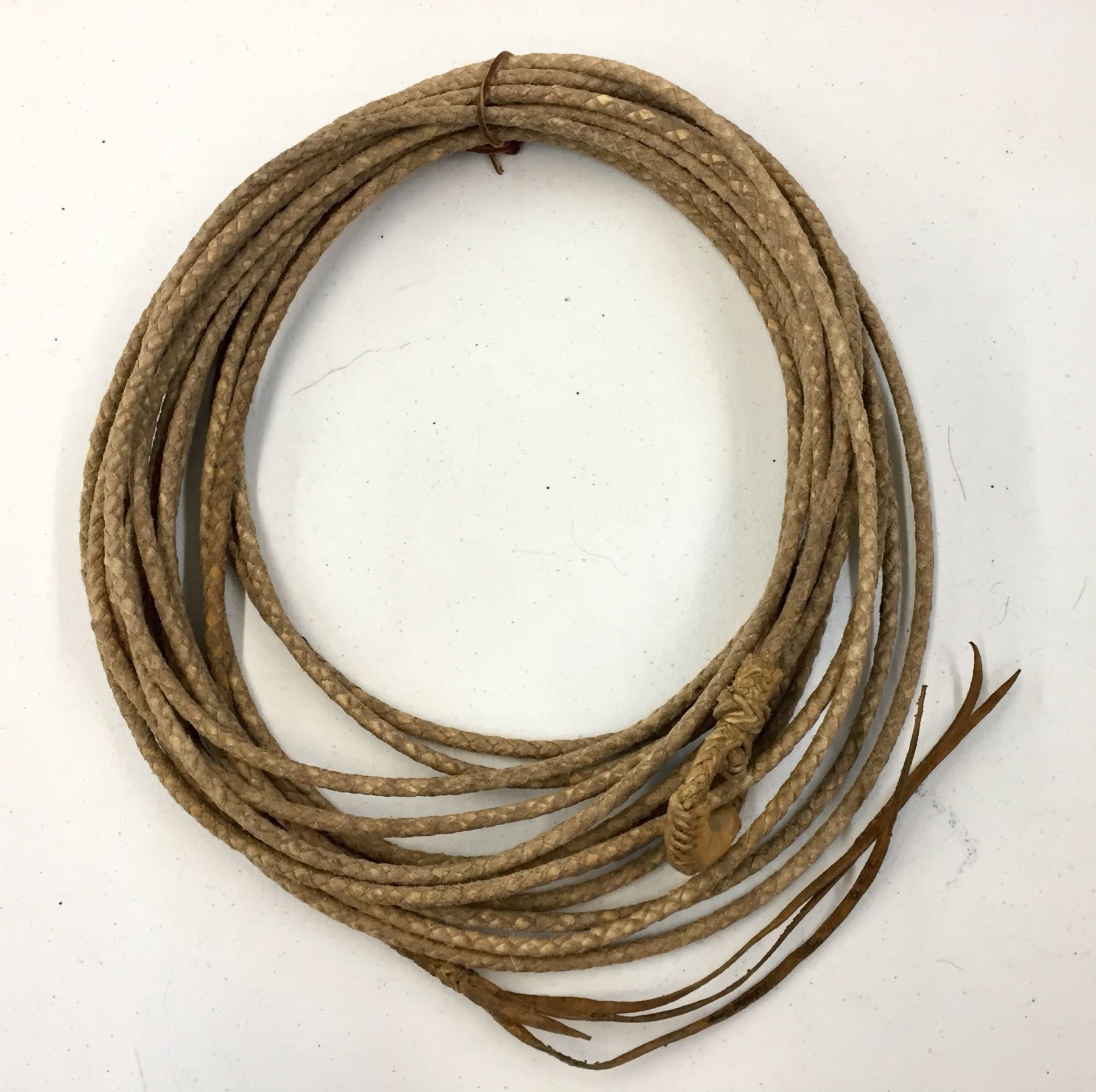 Description: For sale in this lot is a nicer kind of rawhide riata in used by good condition. It is a 4 strand, nicely braided and has a swivel honda. Maker: Unknown Mexican braider. Approx. Age: Vintage. Size: Approx. 40’. Condition: Good for its age, normal wear expected. Please look closely at the pictures - they are an important part of our description. Shipping: There will be a $5 handling / packaging fee for shipping this lot. The actual cost of postage will be added on top of that.