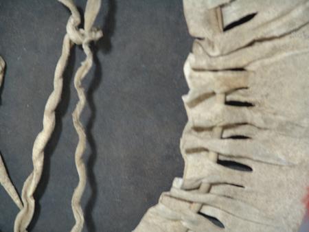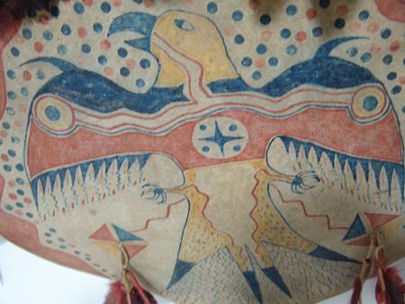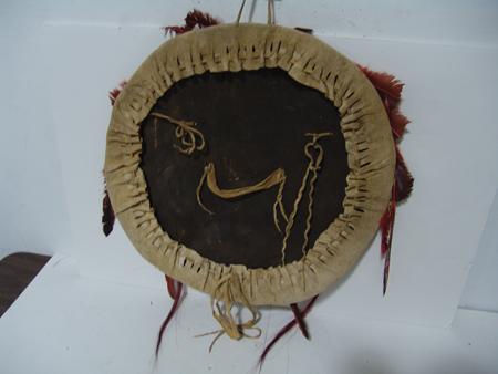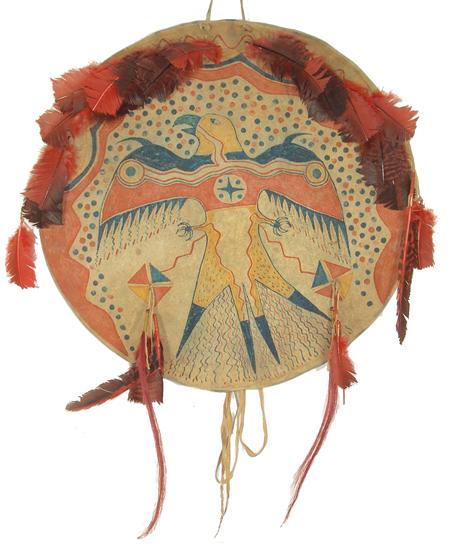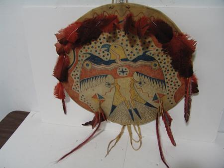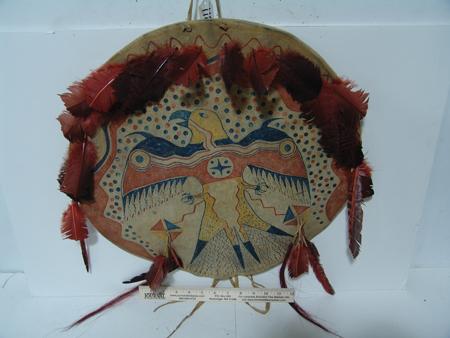 Beautiful hand crafted buckskin covered hard rawhide shield with painted eagle figure, symbols, and feather attachments. 19" diameter.